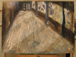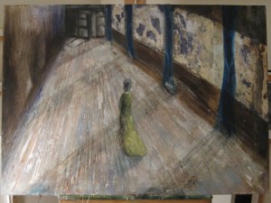 Finding which way to go with the figure in this painting has been one of my tasks lately. She appears ghostlike in the first rendition, and for the other , she is painted in a bright, lime green. Preferring to be somewhere in the middle, I’m going to lighten her up and keep it a matte finish. The walls and windows will be added to.