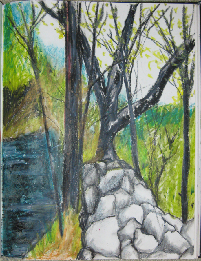 After taking a picture of this magical little place that sat at the bottom of a field behind our house, I sketched it out, getting all stones and trees in place, knowing where the light would come in. Then, started the never ending fun challenge of batik, a true labor of love. Starting the ritual of batik