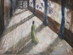 I hope it’s finally finished. This is part three in development. Walking I added darkness to the side walls which seemed to lift the room up and scraped off some wax on the floor’s shadows to resemble the rest of the piece.