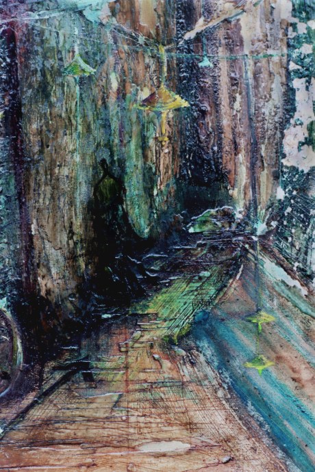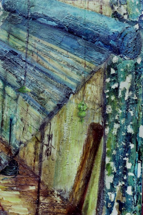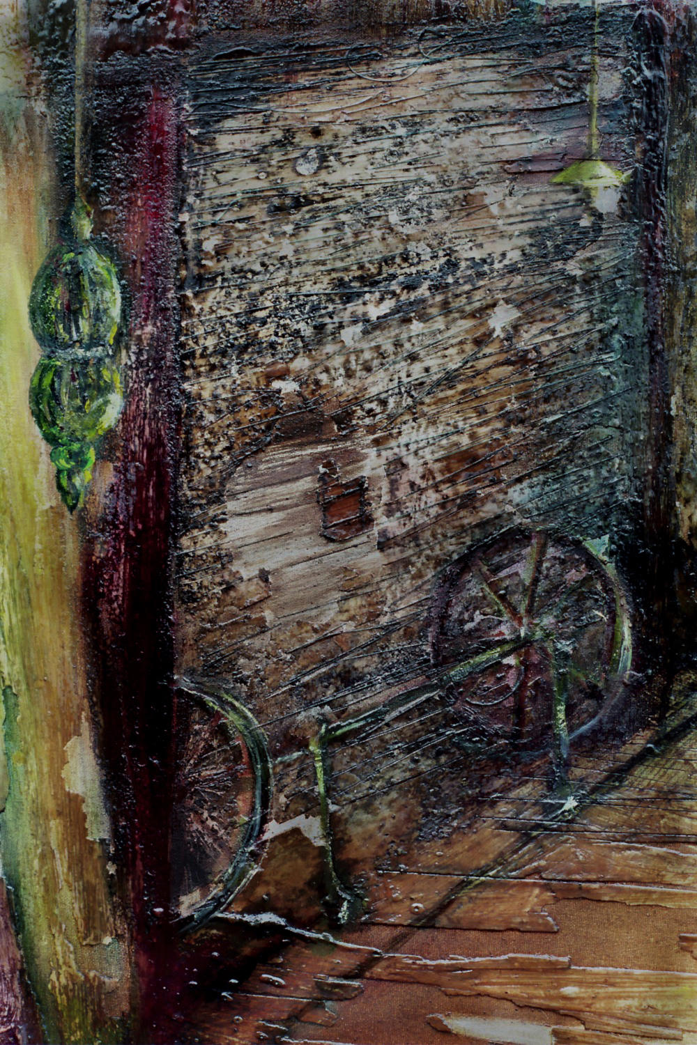 When I first moved into the house I’m living in now, I took a walk out back in the woods and came across the this large mass of wax under a tree. It smelled pungent with gasoline, reminding me of a dank, earthy room. Three years later, still being curious about the wax, I took a chunk of it off and melted it for the painting I was working on, which was a room or attic filled with fabric, strange looms and hanging oil lamps. The smell of of the wax was peculiar, it took me to another world, sparking new creative thought. Because smell is used by our most ancient part of the brain, I’m sure the unconscious part of myself was sensing all kinds of information from this potent wax. The smell report.