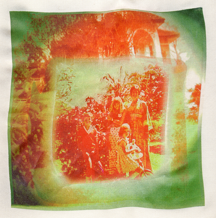 In college, one of my assignments was to tell a story through images on cloth using a color copier. I rummaged through my parents collection of photo albums when at home one winter break and found a picture of Christmas morning, 1975? Probably one of the best Christmases ever, where I was given this tricycle with a back seat! How I longed for that one.