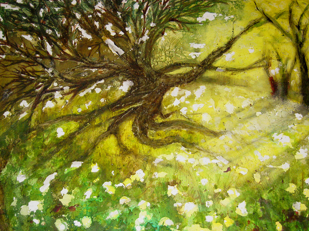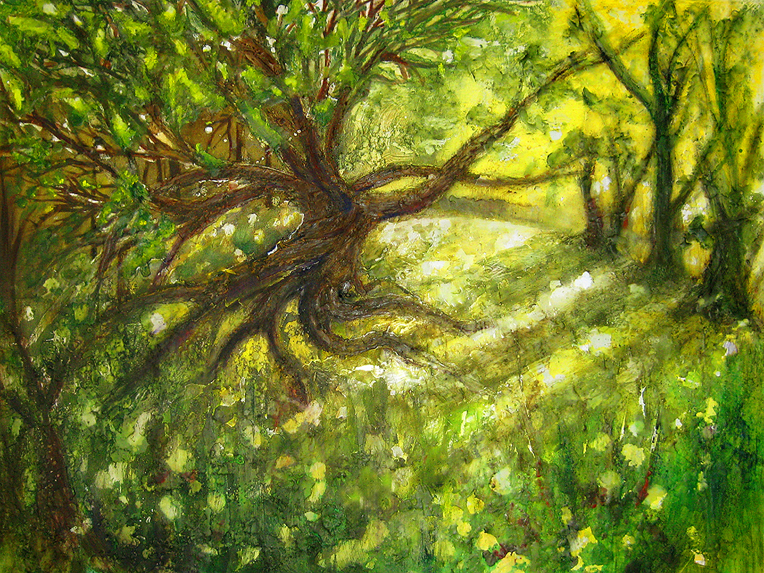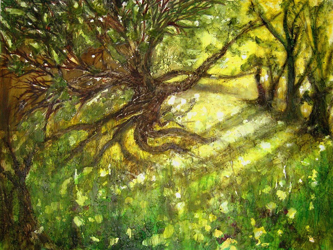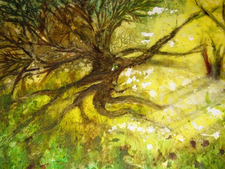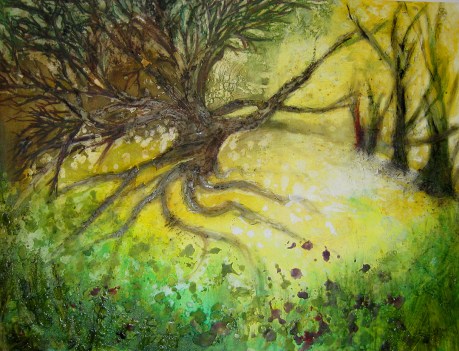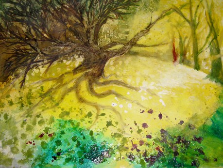 I think this one is close to being done, although, it may need more red and blue and more work on defining the roots. I added purple to the dark shadows to create a more balanced tone to the eye. The title to this piece hasn’t come to me yet… The subject is a tree that has seen many seasons and perhaps experienced ancient times with its twisted branches and gigantic roots coming out of the grass.