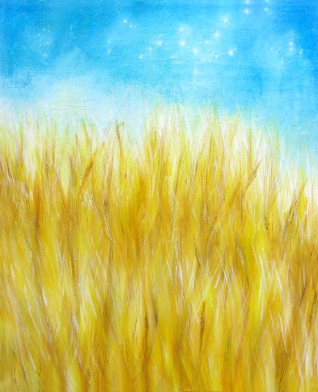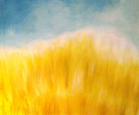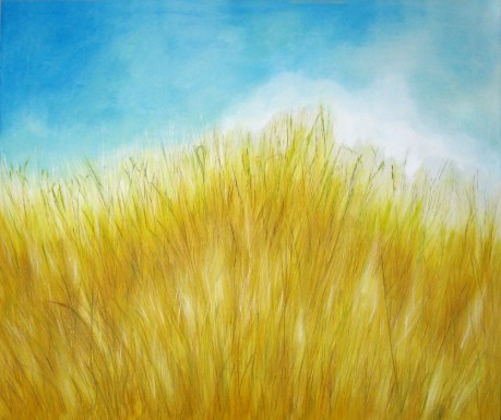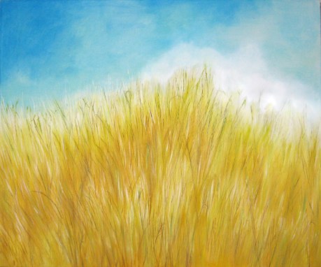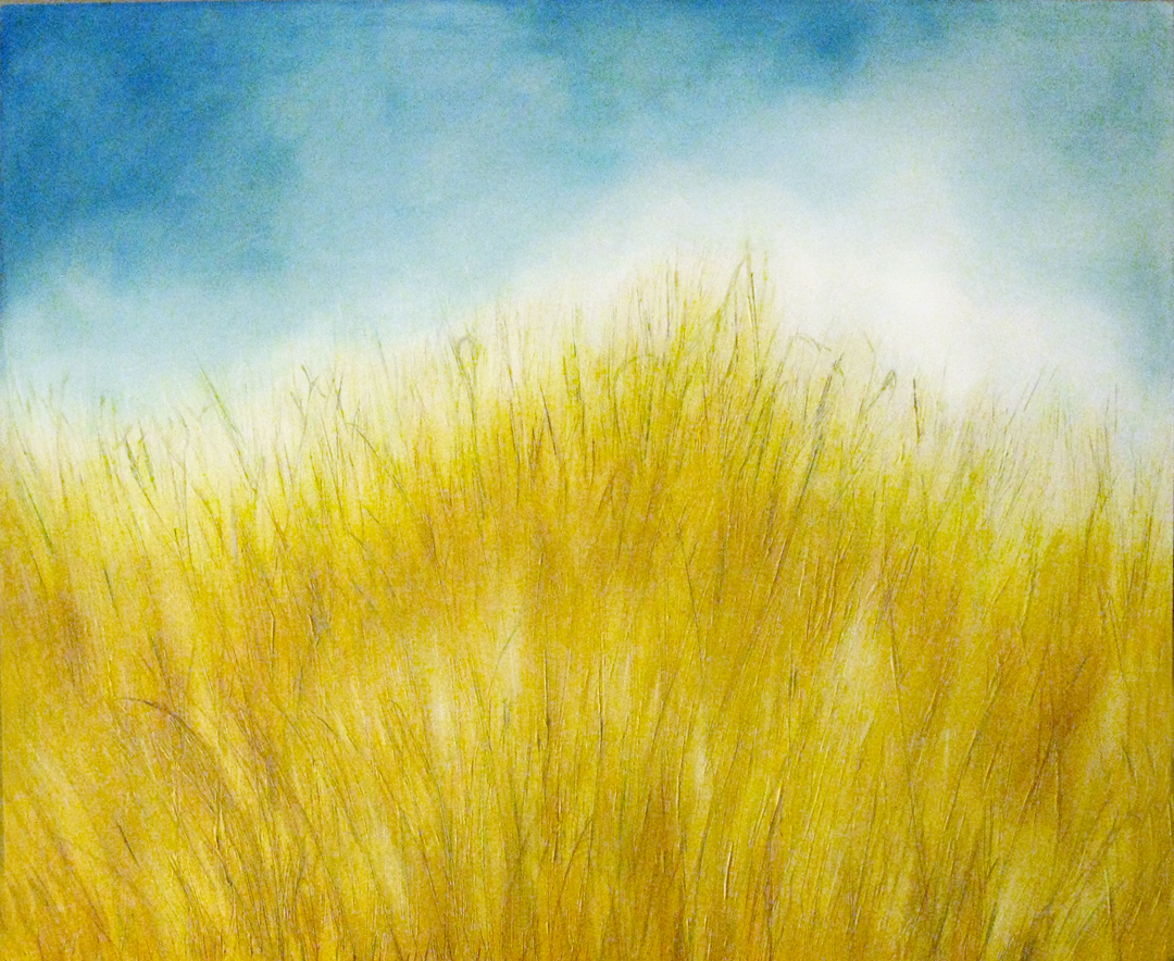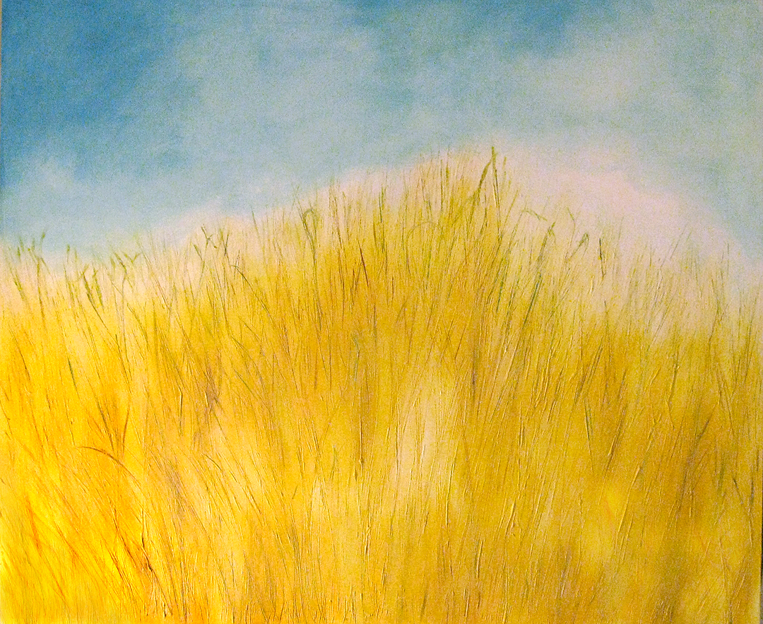 Finally, it is the end of 2011 and I have just started this series: Where Earth Meets Sky. The difference with these paintings will be the omission of wax. I don’t want the surface texture to take away from the piece. The sky has many layers of smoothed gesso and then treated in the end with a high gloss polymer. The grass, however is carved out of wet gesso and then dried, giving a little texture to the piece. Oils are used in layers of intense yellows and oranges with hints of brown and green.