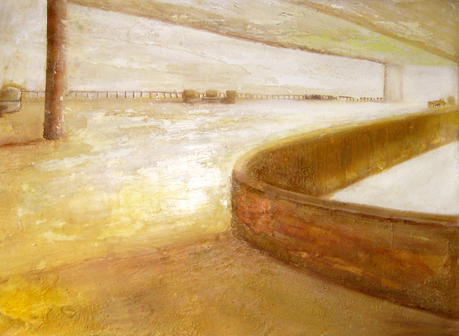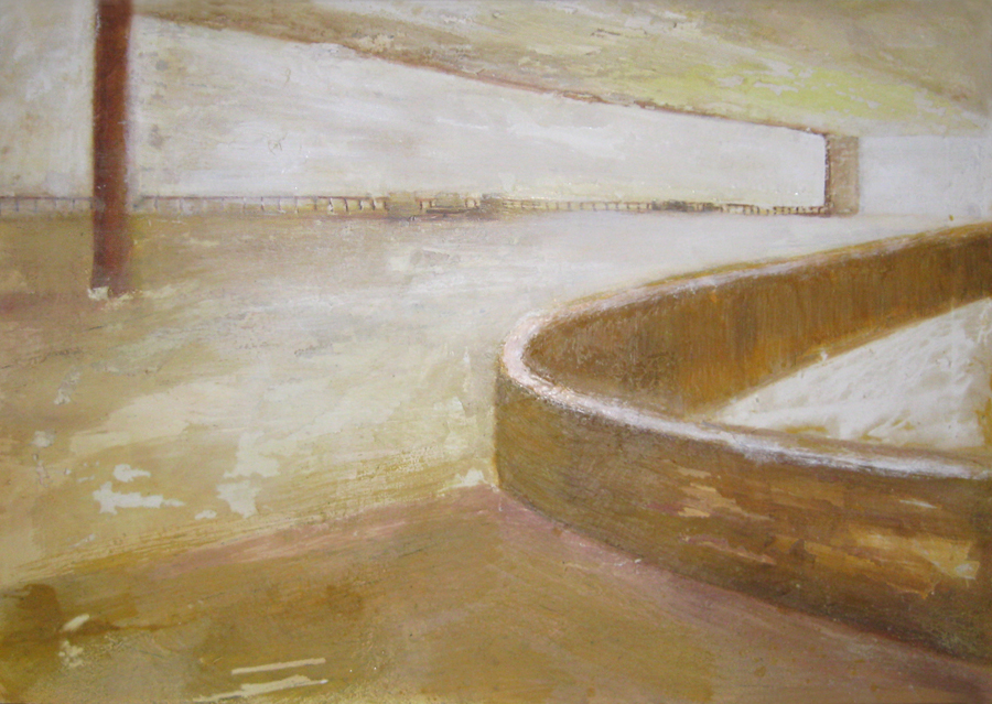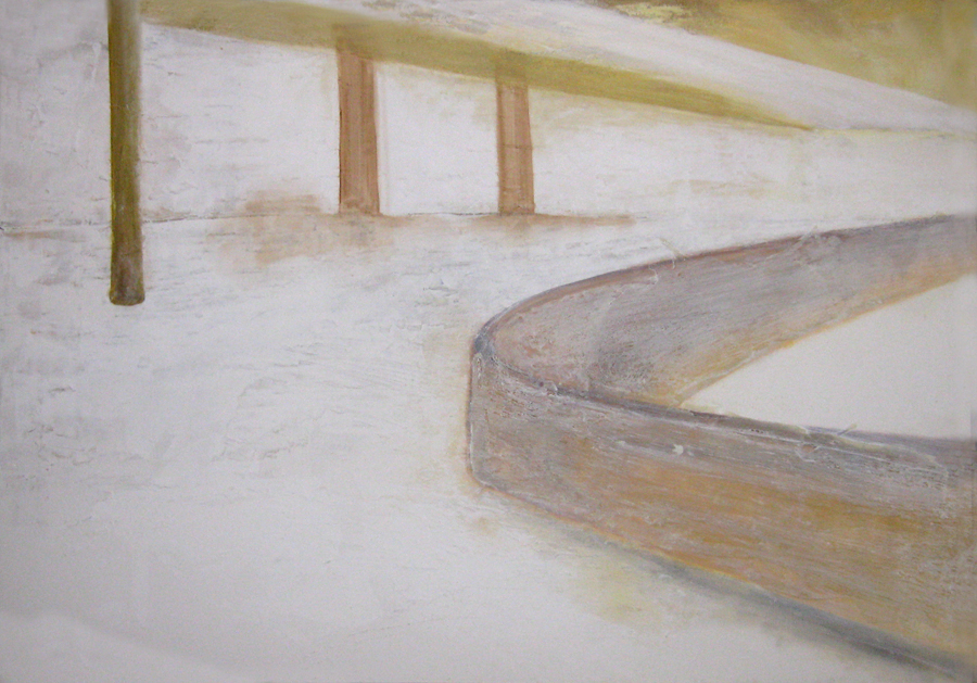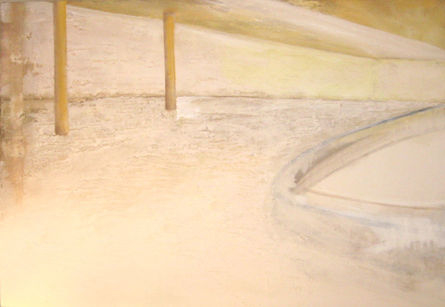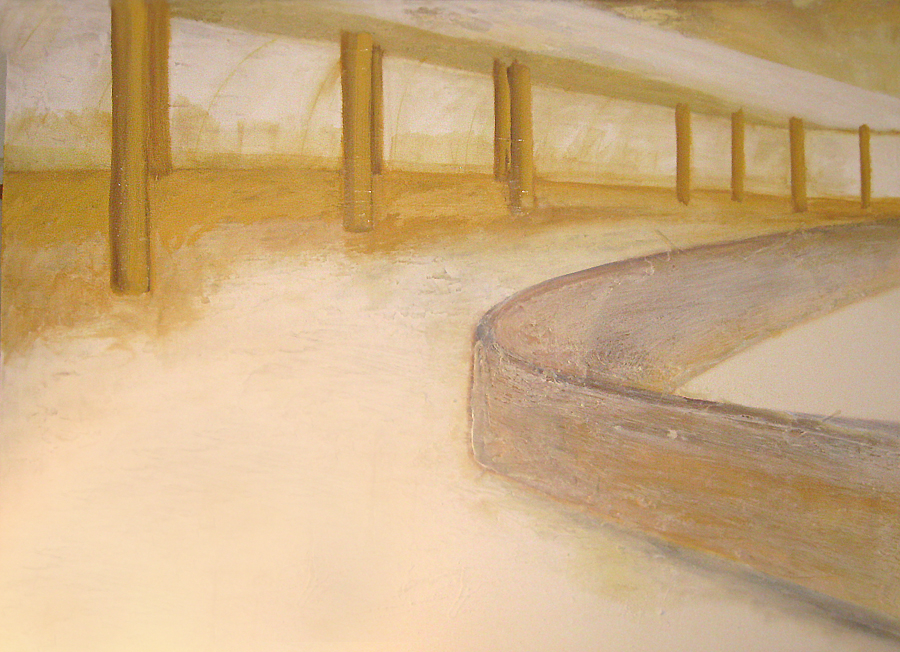 Here, a massive room, with what appears to be afternoon light pouring in, was titled from the very beginning, “Last Day”. The intent for this piece was strong and stayed very much alive, even when I didn’t paint or look at it for days. Months went by and I still knew the feeling quite well whenever I approached it. The space is out of a dream where souls go after their life is over and a new one is about to begin. The room is always empty, but has remnants of spirits living on, unseen. The rush of light warms the space and I imagine walking through to another life. The feeling is of anticipation, similar to the last day of school where everyone has been let out and you still remain, perhaps just wondering around, finishing up and getting ready to go with unfamiliar excitement in your heart. A bittersweet feeling comes into play as well. When the lessons are finished and still fresh in our memory, a tinge of longing and loneliness present themselves, allowing us to ponder at what has been, knowing that it’s gone forever.