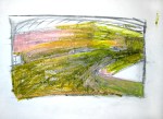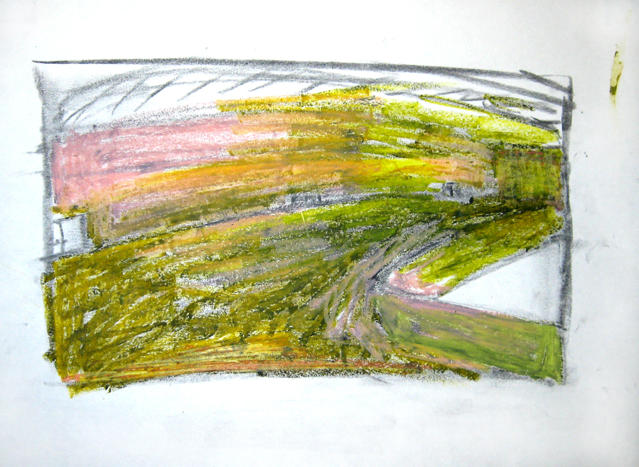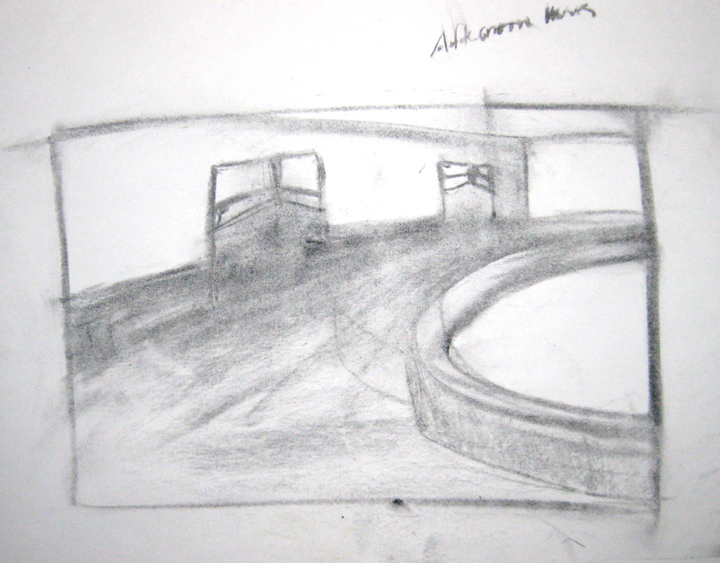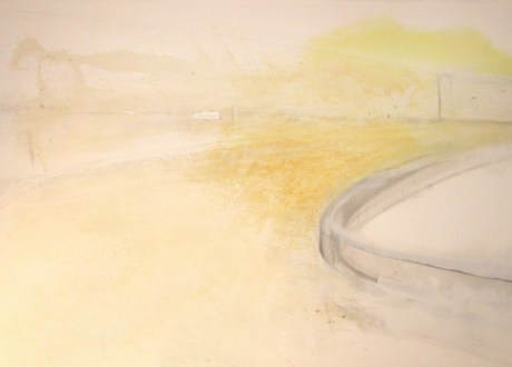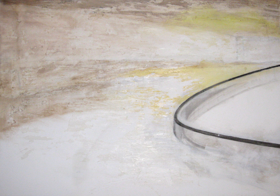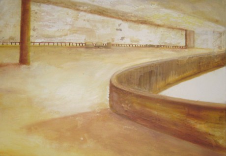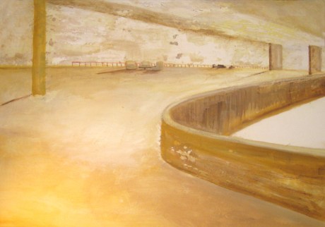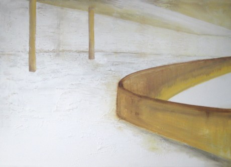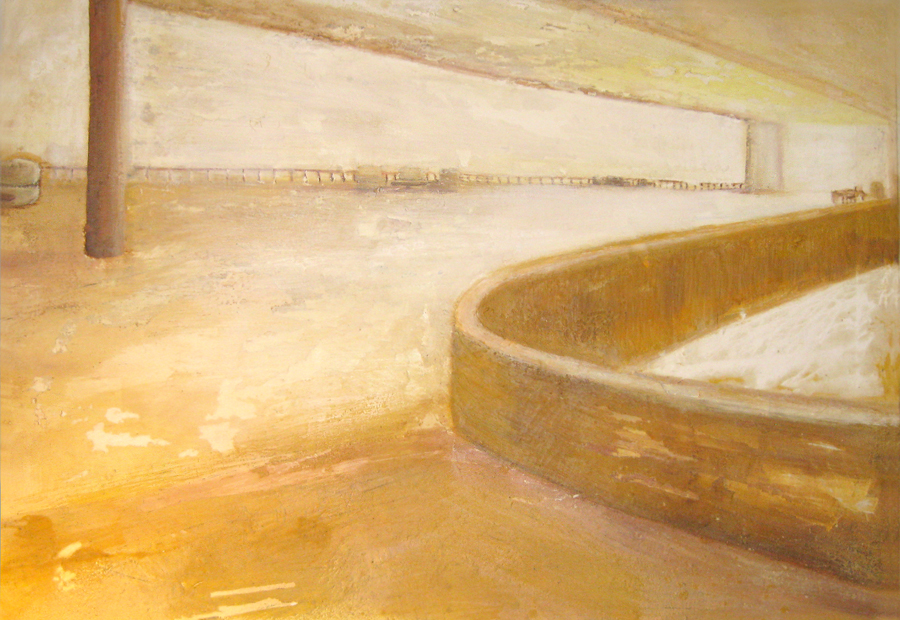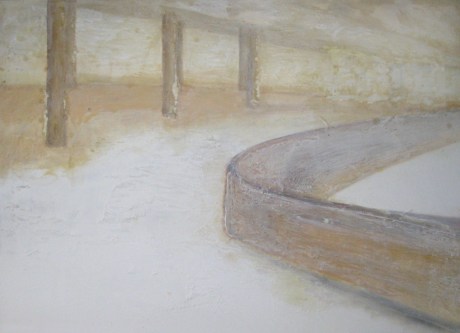 Here, a massive room, with what appears to be afternoon light pouring in, was titled from the very beginning, “Last Day”. The intent for this piece was strong and stayed very much alive, even when I didn’t paint or look at it for days. Months went by and I still knew the feeling quite well whenever I approached it. The space is out of a dream where souls go after their life is over and a new one is about to begin. The room is always empty, but has remnants of spirits living on, unseen. The rush of light warms the space and I imagine walking through to another life. The feeling is of anticipation, similar to the last day of school where everyone has been let out and you still remain, perhaps just wondering around, finishing up and getting ready to go with unfamiliar excitement in your heart. A bittersweet feeling comes into play as well. When the lessons are finished and still fresh in our memory, a tinge of longing and loneliness present themselves, allowing us to ponder at what has been, knowing that it’s gone forever.