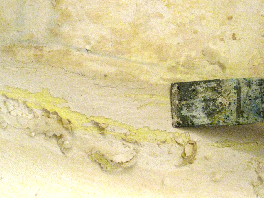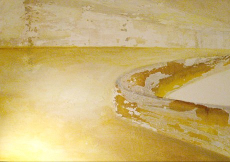 With this painting, so much time went by as I struggled with placement, hues, light, pretty much all of it. There were a few major changes to the objects in the room. I had originally painted two pillars, then one, then ten of them, and back to one. I liked one the most, it gave a more unusual feel that has become a signature for the bleedthrough (past) series; rooms that are slightly angled and reach far into the distance, emanating an unknown feeling.