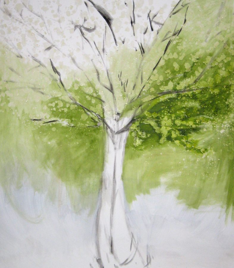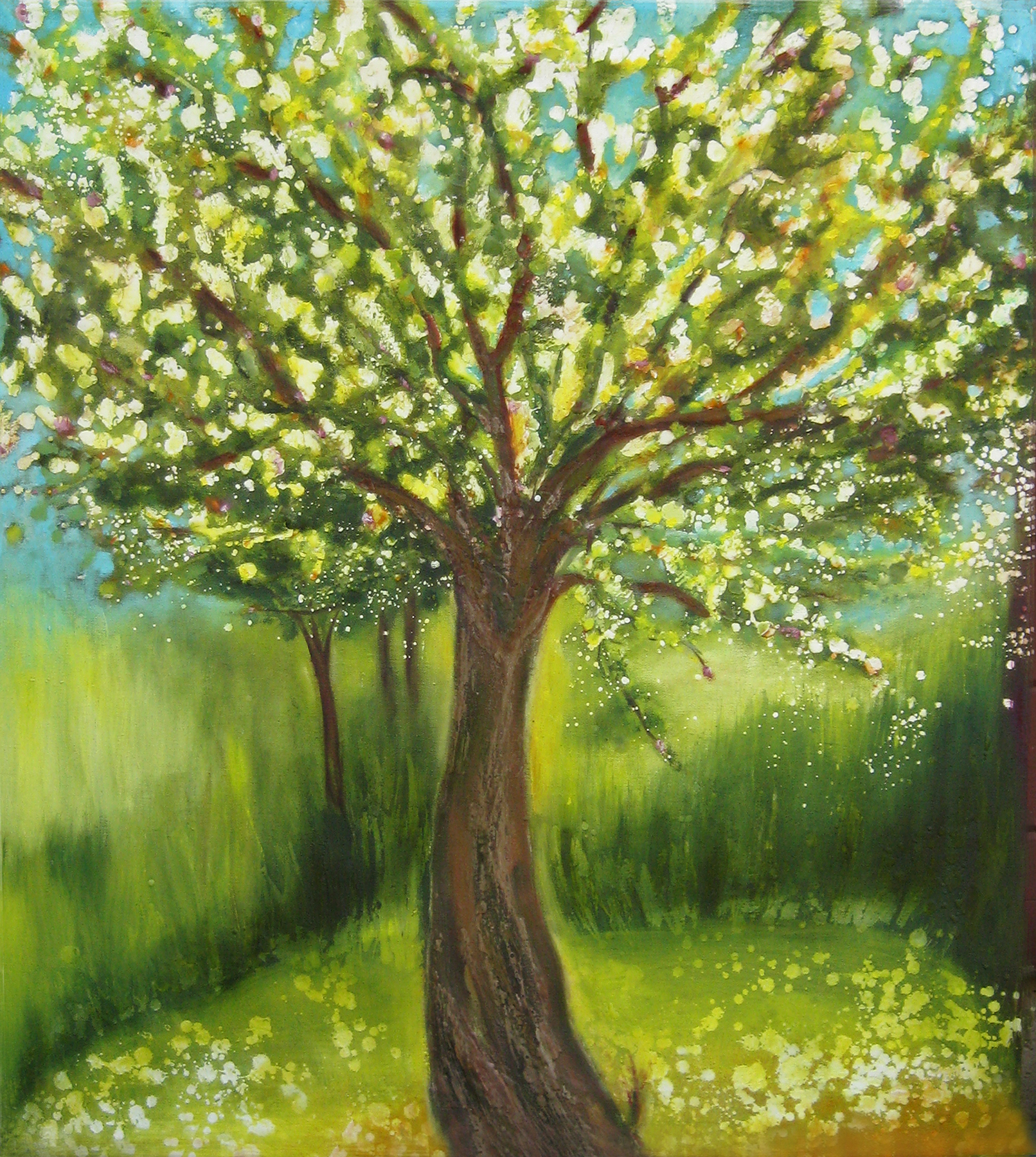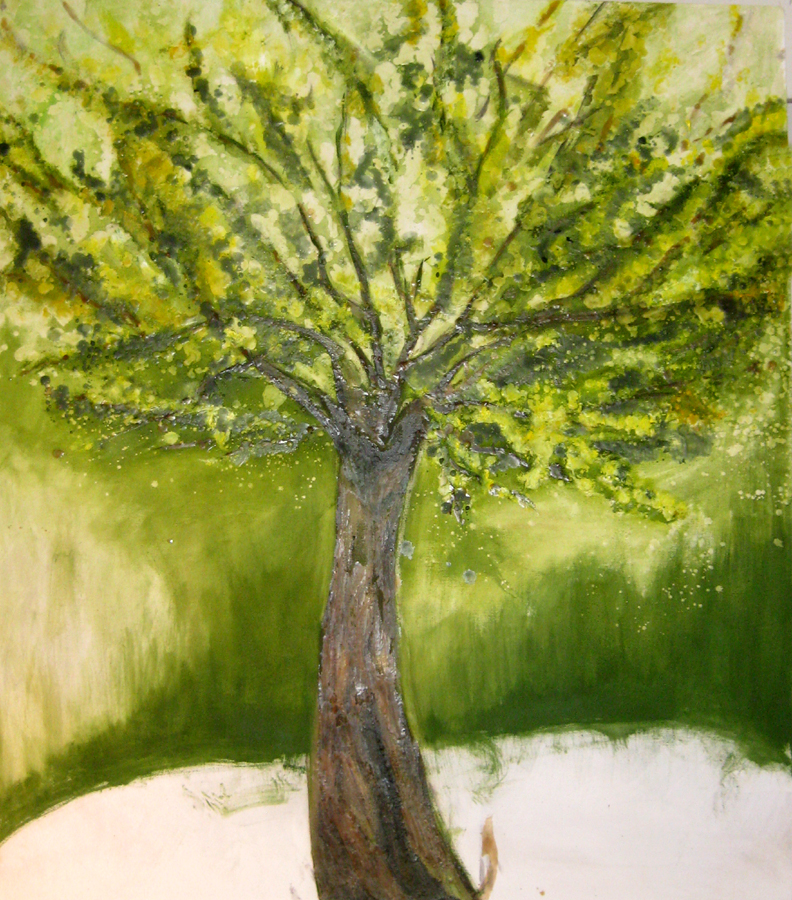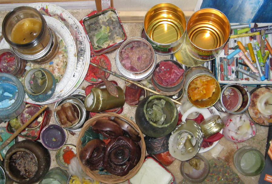 In order to get a true bright white, I paint melted wax on the canvas. It acts as a resist to the oil paint. After painting over the wax, I’ll scrape it off, revealing the raw, gesso canvas underneath.