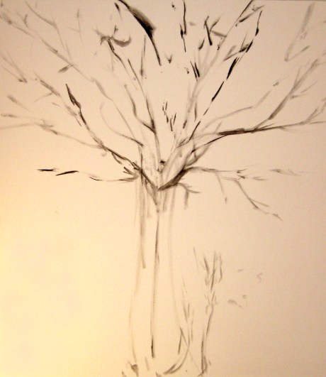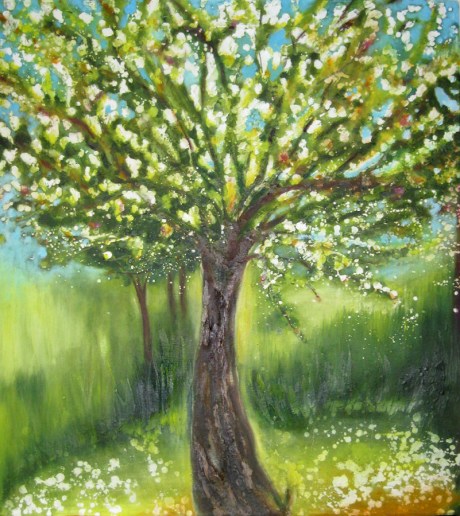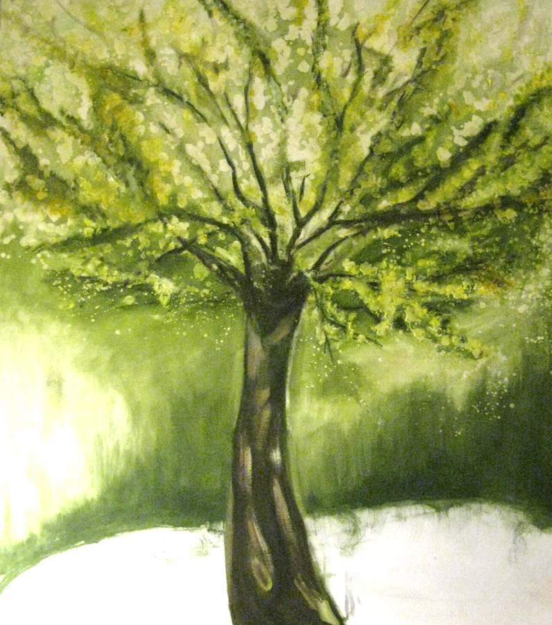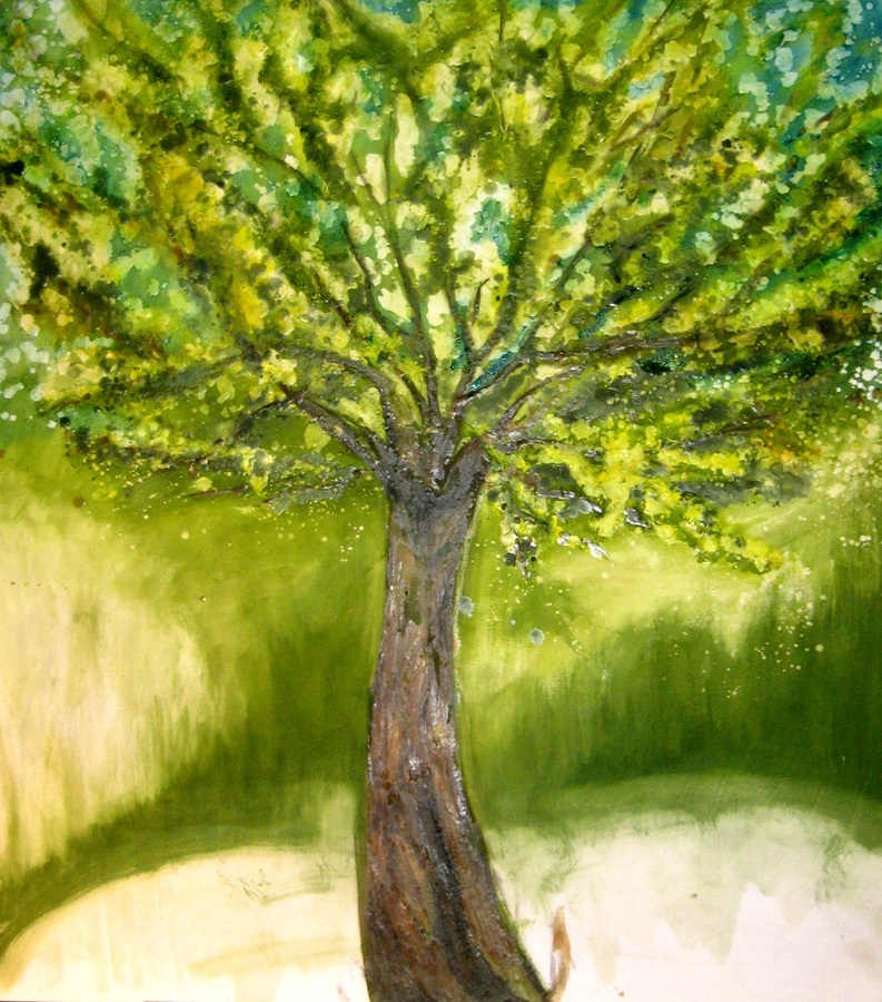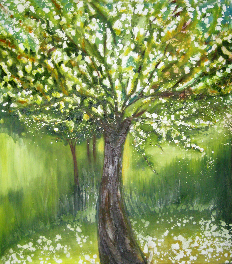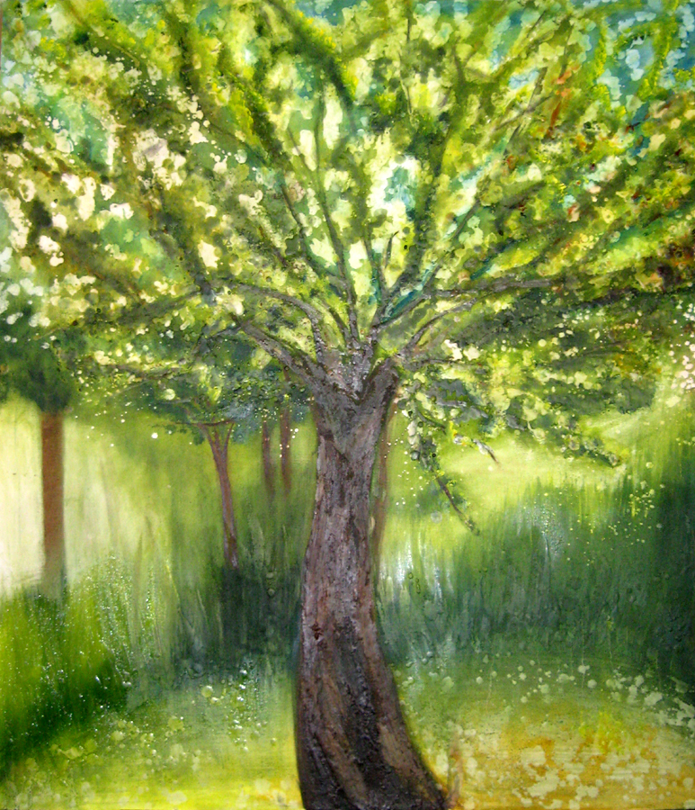 In order to get a true bright white, I paint melted wax on the canvas. It acts as a resist to the oil paint. After painting over the wax, I’ll scrape it off, revealing the raw, gesso canvas underneath.