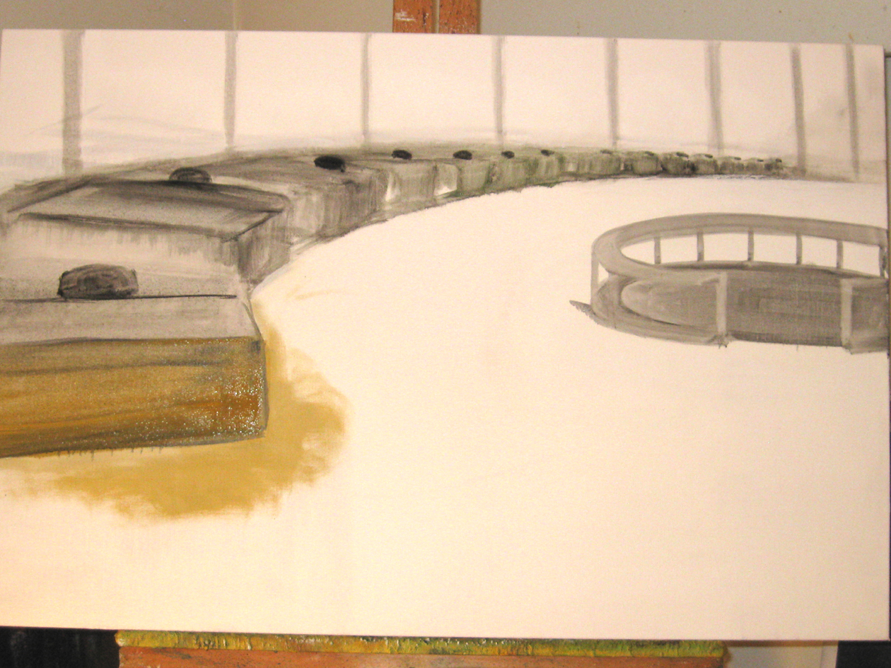 This piece is not quite finished. There may need to be more sewing in foreground and around the abstract layering of wax. The figures in this piece appeared and disappeared. I wanted to create a static about them, but each time I brought them back into detail. The title of the piece is still up for grabs. Using the right words to describe this is not coming at the moment. The image started a few years ago, when I was painting the bleedthrough (future) series. The image was of two beings creating another in their likeness and this is how they went about it, putting a pail into a long trench in the ground. Although these figures were supposed to be more alien like, they kept reappearing as strictly human. I went along with it and any other detail that arose. But now this painting has ended up belonging to a different series; making it so, where the human/earth relationship is more present.