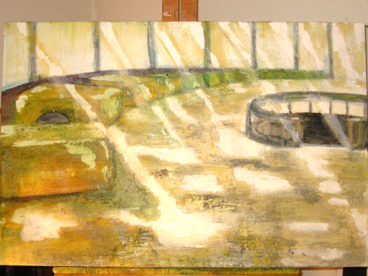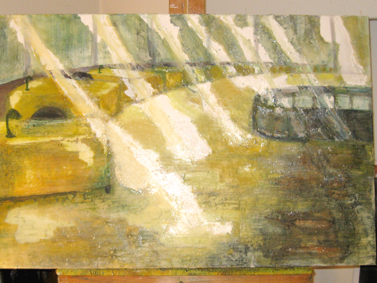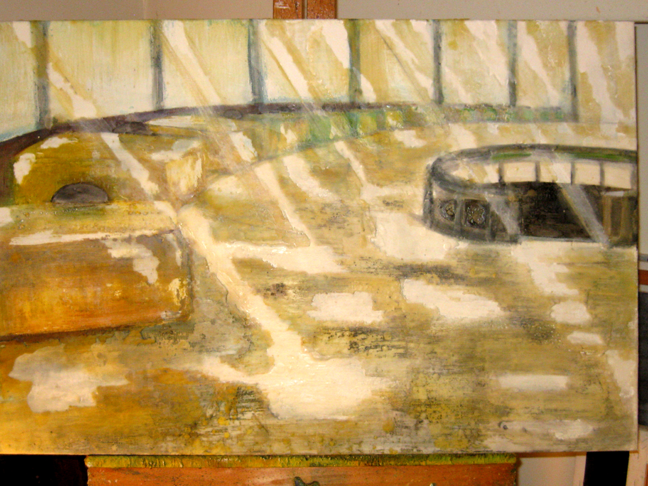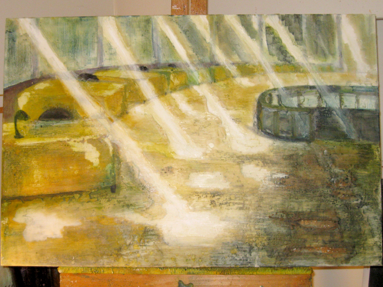 The title and the painting itself may not be finished. I’ll be adding a thick layer of high gloss polymer to the surface, to enhance the shine of the piece. I wanted to make the stars glow in vivid white, so I used gesso on top of the oils and wax. The perspective diminished a bit with the addition of black. At one point, the idea turned from darkness entering a room and taking over the light, to the whole room falling away, letting space enter with spots of light. The idea wasn’t really about darkness being evil, but that it is, I imagine, where every thought begins, a place of pure potential. When painting this scene, I have come to realize that the task of making darkness enter light is impossible. Coincidently, it seems light always ends up consuming the darkness. From the words of an anonymous Russian sage,”There are no resounding victories of the dark side.”
