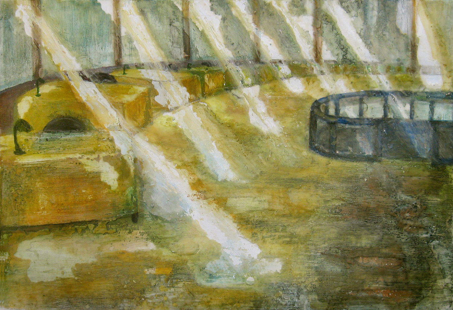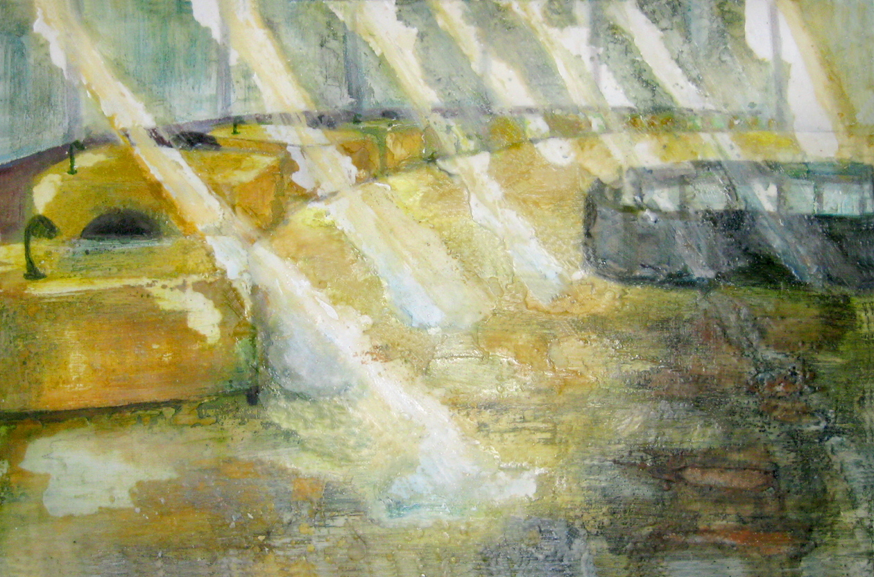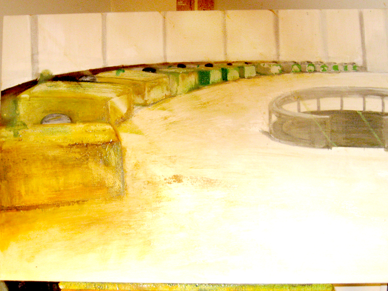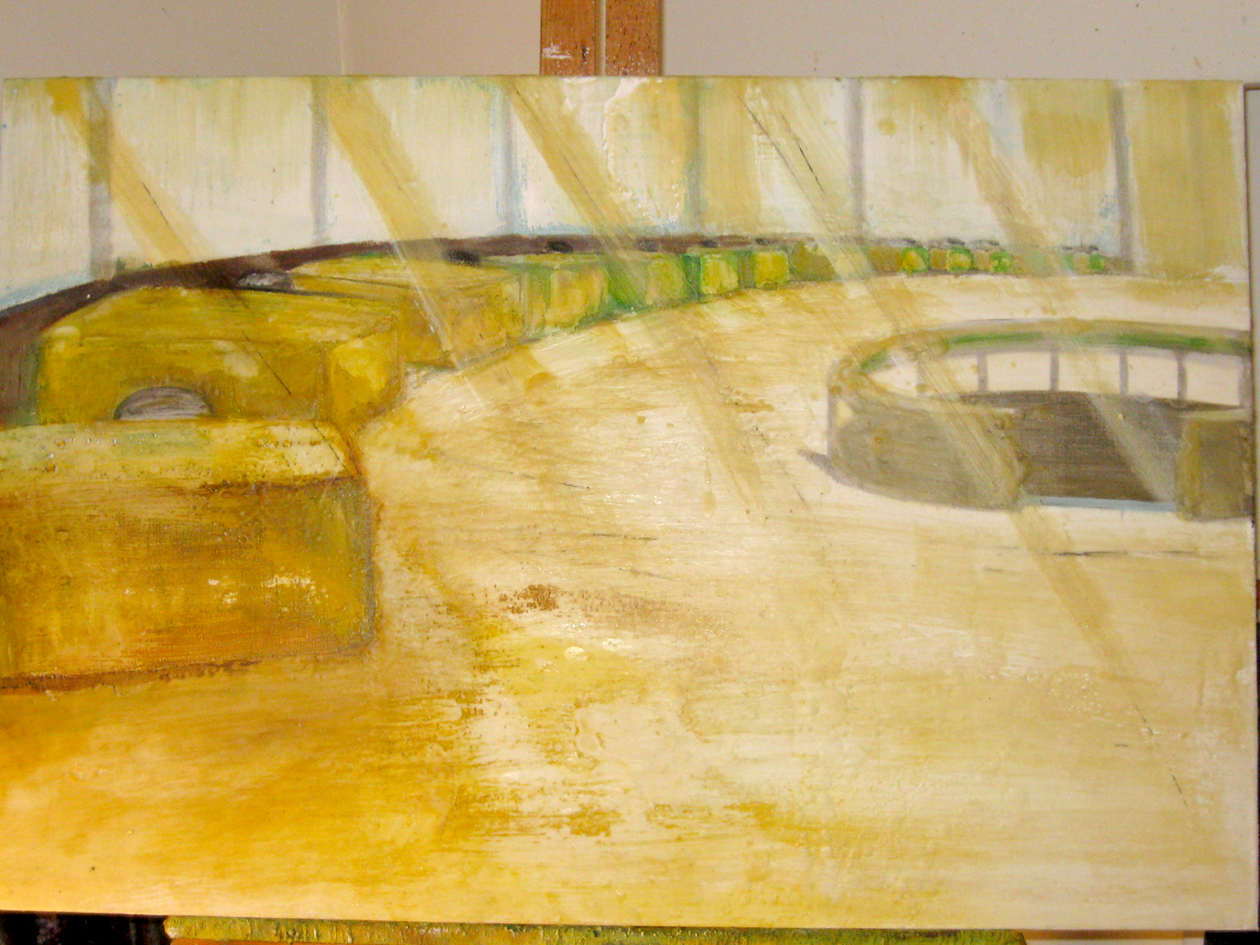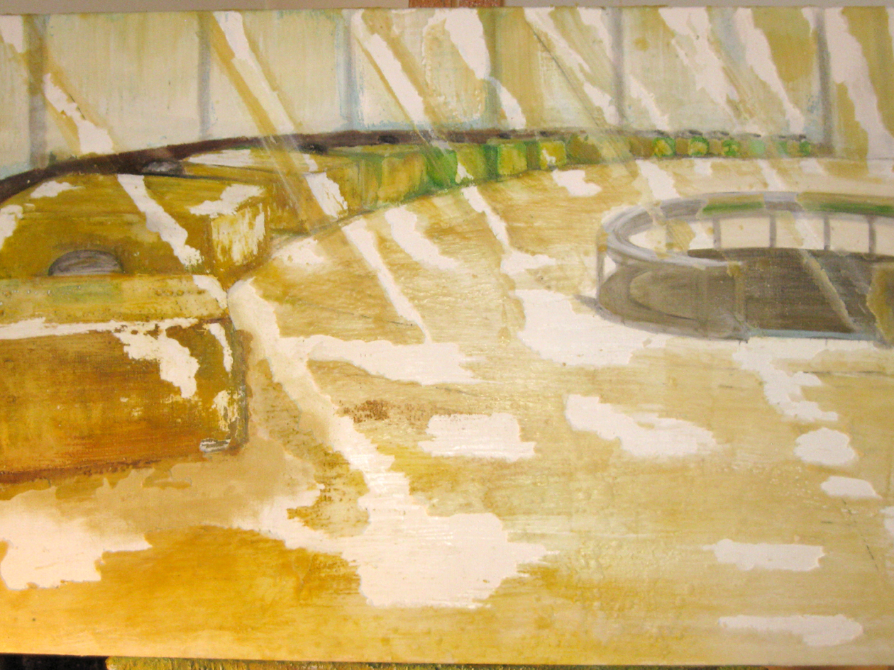 The title and the painting itself may not be finished. I’ll be adding a thick layer of high gloss polymer to the surface, to enhance the shine of the piece. I wanted to make the stars glow in vivid white, so I used gesso on top of the oils and wax. The perspective diminished a bit with the addition of black. At one point, the idea turned from darkness entering a room and taking over the light, to the whole room falling away, letting space enter with spots of light. The idea wasn’t really about darkness being evil, but that it is, I imagine, where every thought begins, a place of pure potential. When painting this scene, I have come to realize that the task of making darkness enter light is impossible. Coincidently, it seems light always ends up consuming the darkness. From the words of an anonymous Russian sage,”There are no resounding victories of the dark side.”