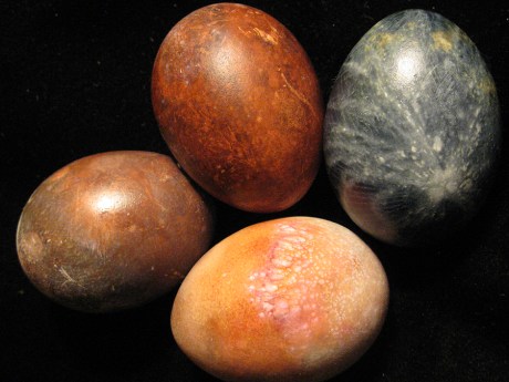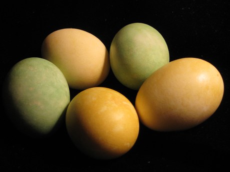 Dyeing eggs with blueberries, turmeric, spinach, red cabbage and cheese cloth.