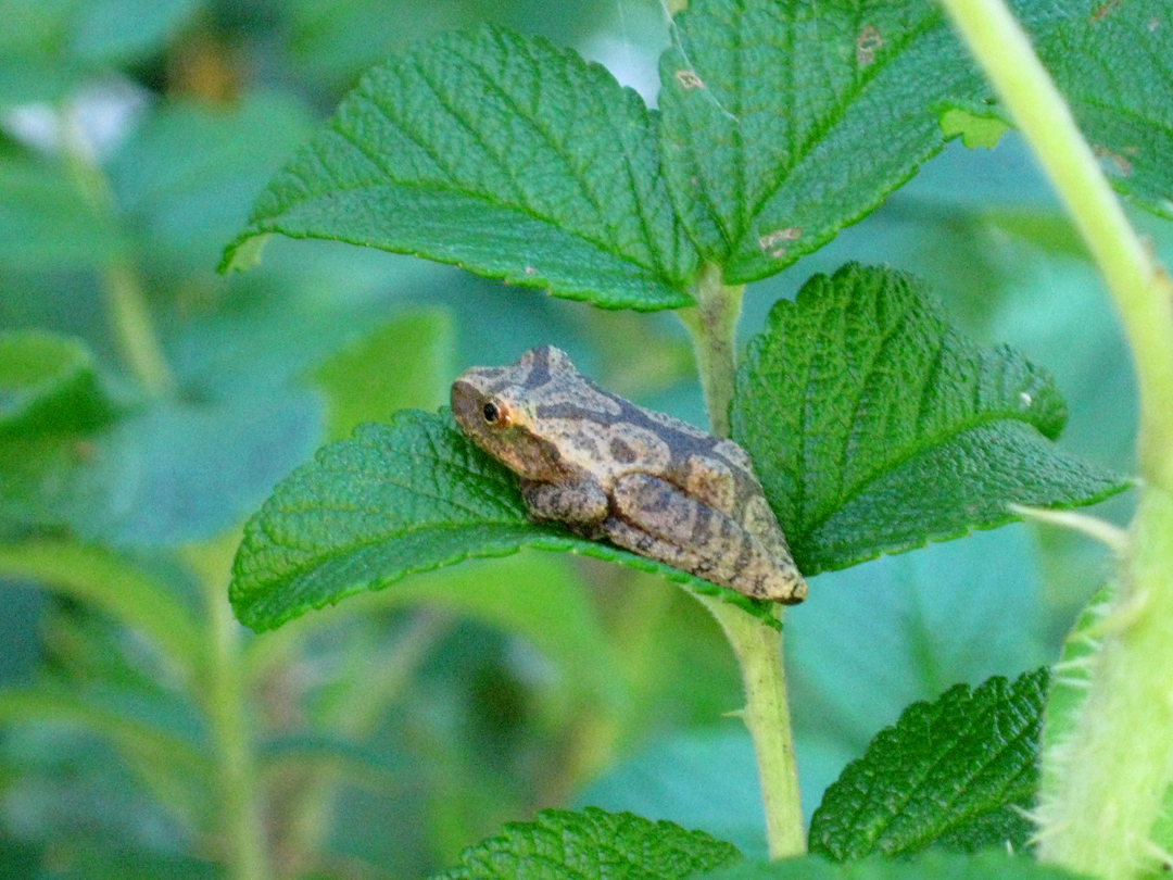 is in front of the house. She seems to love this blue pot filled with water and Elephant Ears. It’s situated right under the porch light where moths gather. I’m guessing this frog is a “she” because smaller versions of herself were nearby for a while, until they ventured off to who knows where.