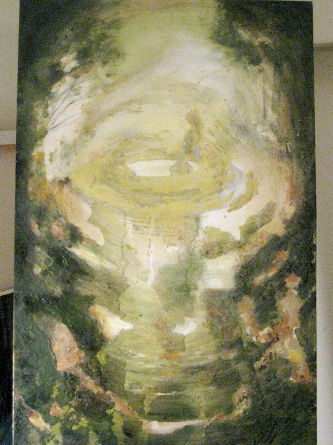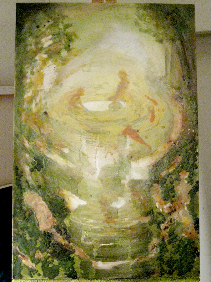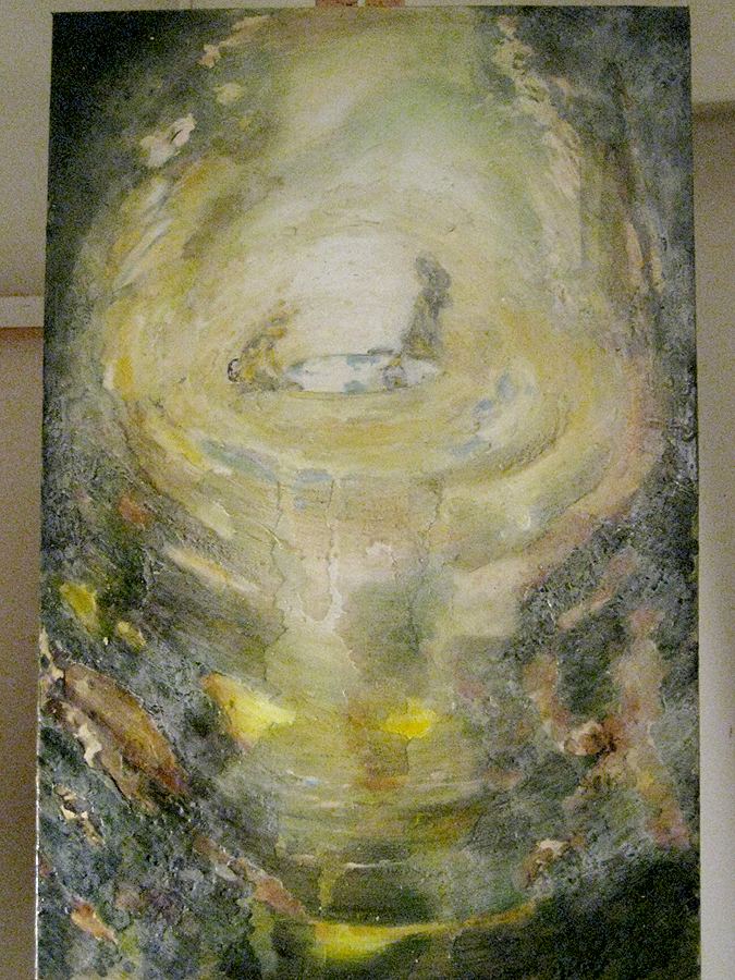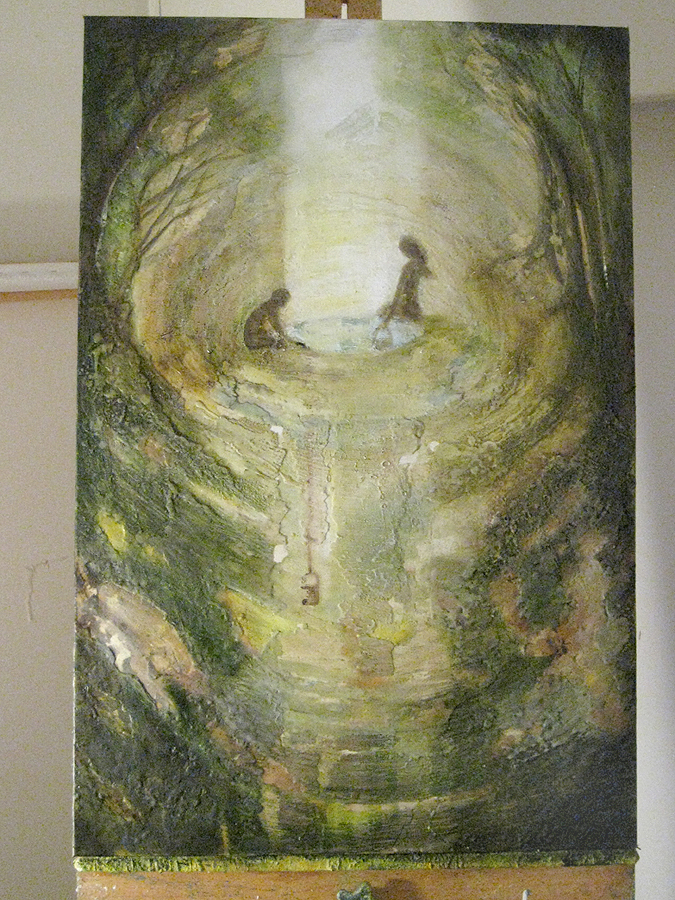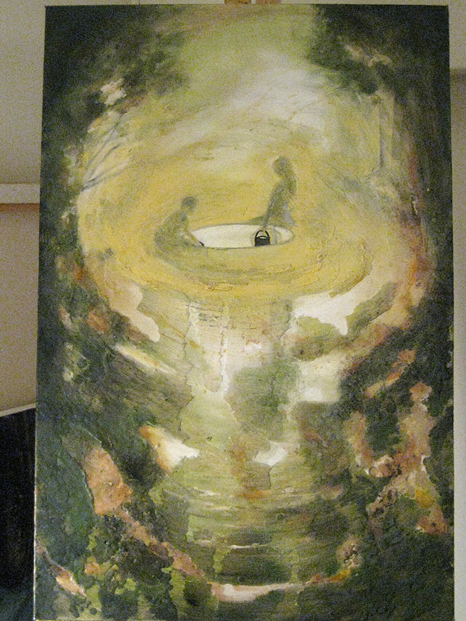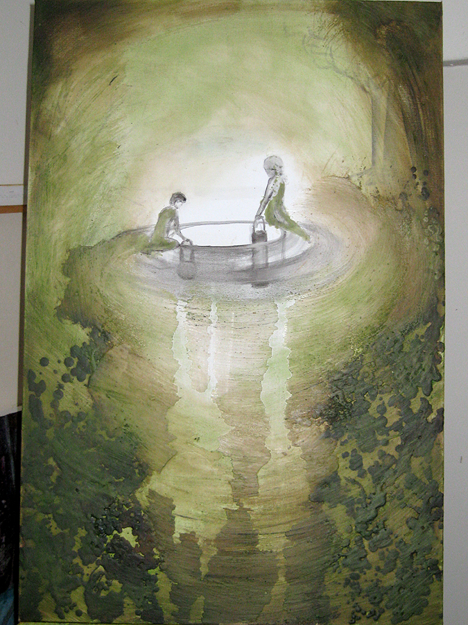 This piece is not quite finished. There may need to be more sewing in foreground and around the abstract layering of wax. The figures in this piece appeared and disappeared. I wanted to create a static about them, but each time I brought them back into detail. The title of the piece is still up for grabs. Using the right words to describe this is not coming at the moment. The image started a few years ago, when I was painting the bleedthrough (future) series. The image was of two beings creating another in their likeness and this is how they went about it, putting a pail into a long trench in the ground. Although these figures were supposed to be more alien like, they kept reappearing as strictly human. I went along with it and any other detail that arose. But now this painting has ended up belonging to a different series; making it so, where the human/earth relationship is more present.