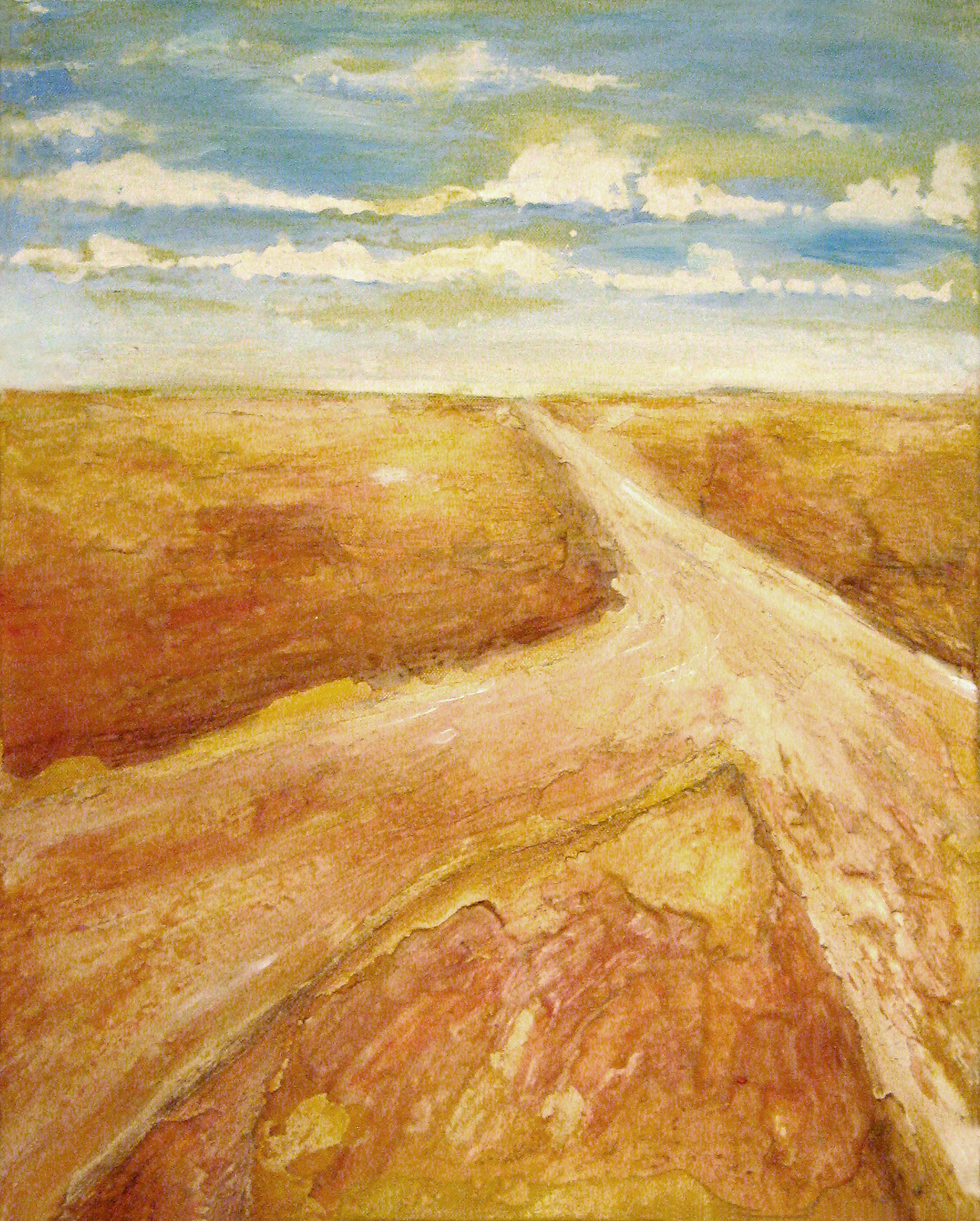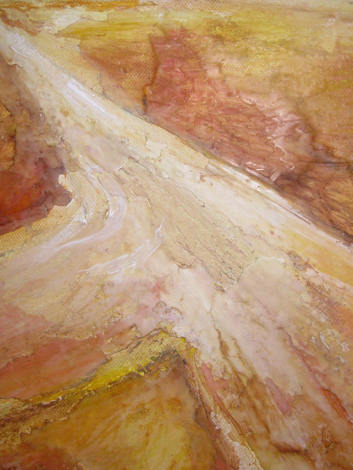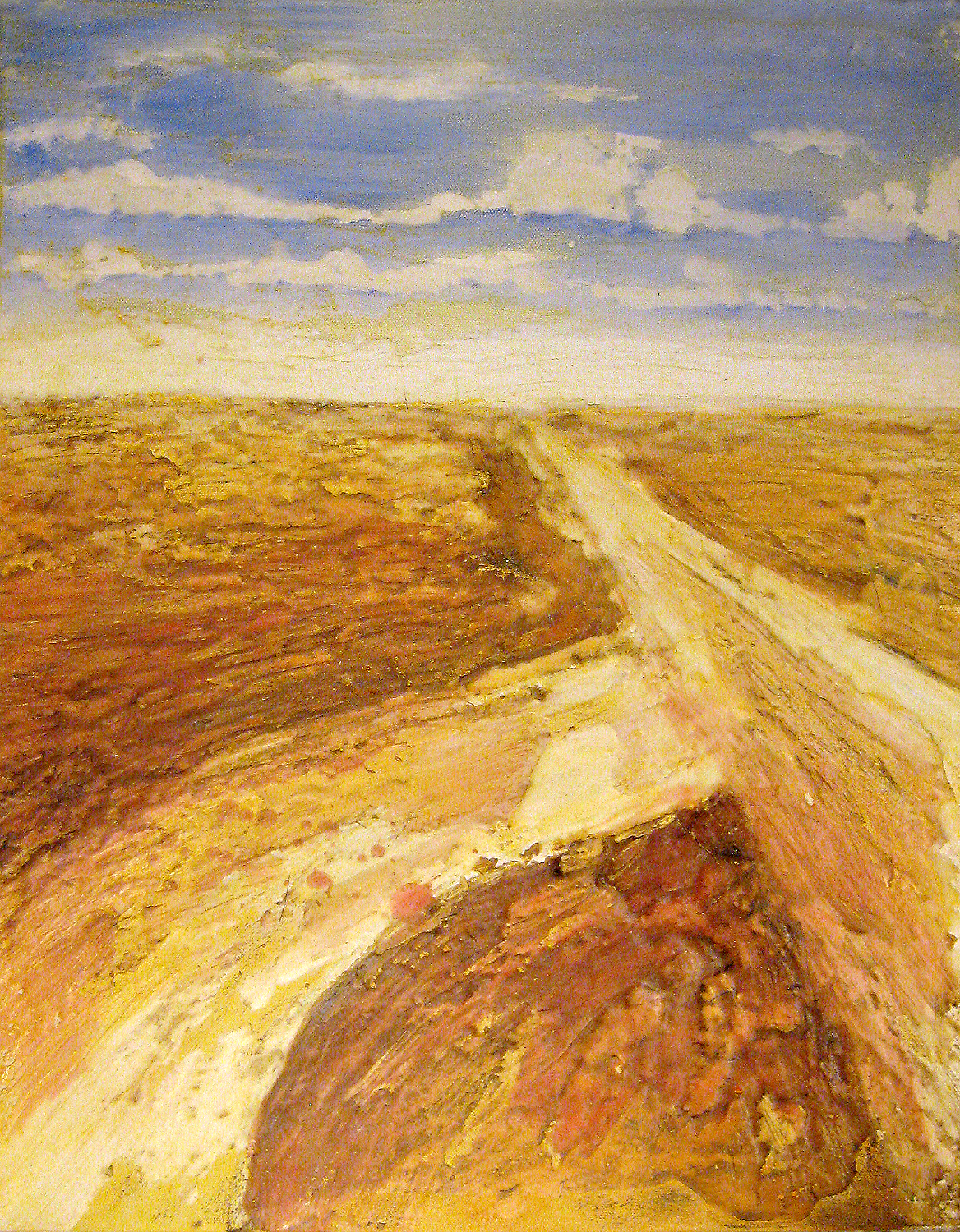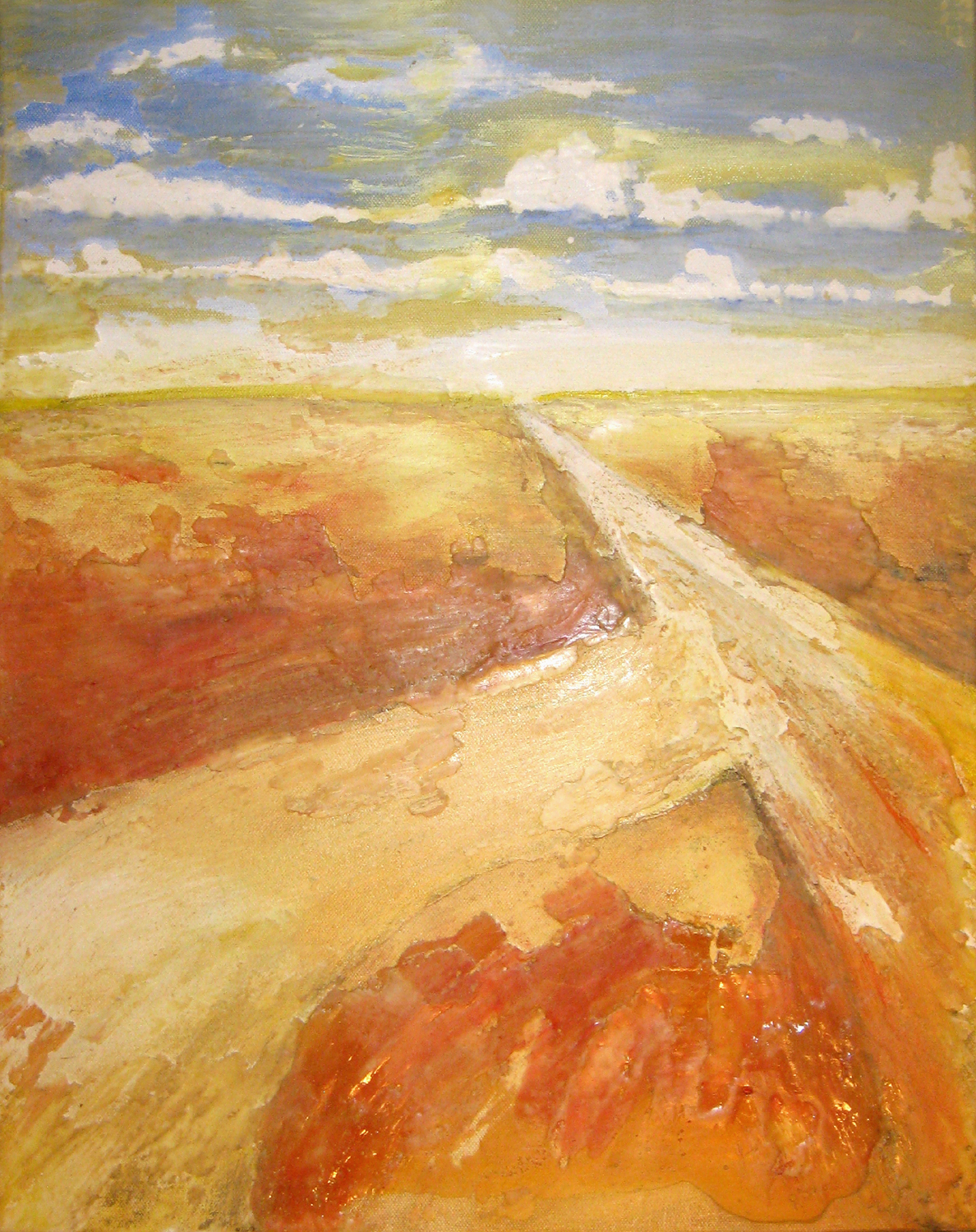 From the ink sketch, I knew that I wanted to keep this image as simple as possible. The horizon line was the most important part of the scene, it needed show how expansive this space can be. After adding more layers of wax to get that eroding feeling of things past, the picture became a heavily textural piece with the overhead viewpoint just askew. When there is plenty of texture, it seems to create a more energetic feeling with a sense of time moving along.