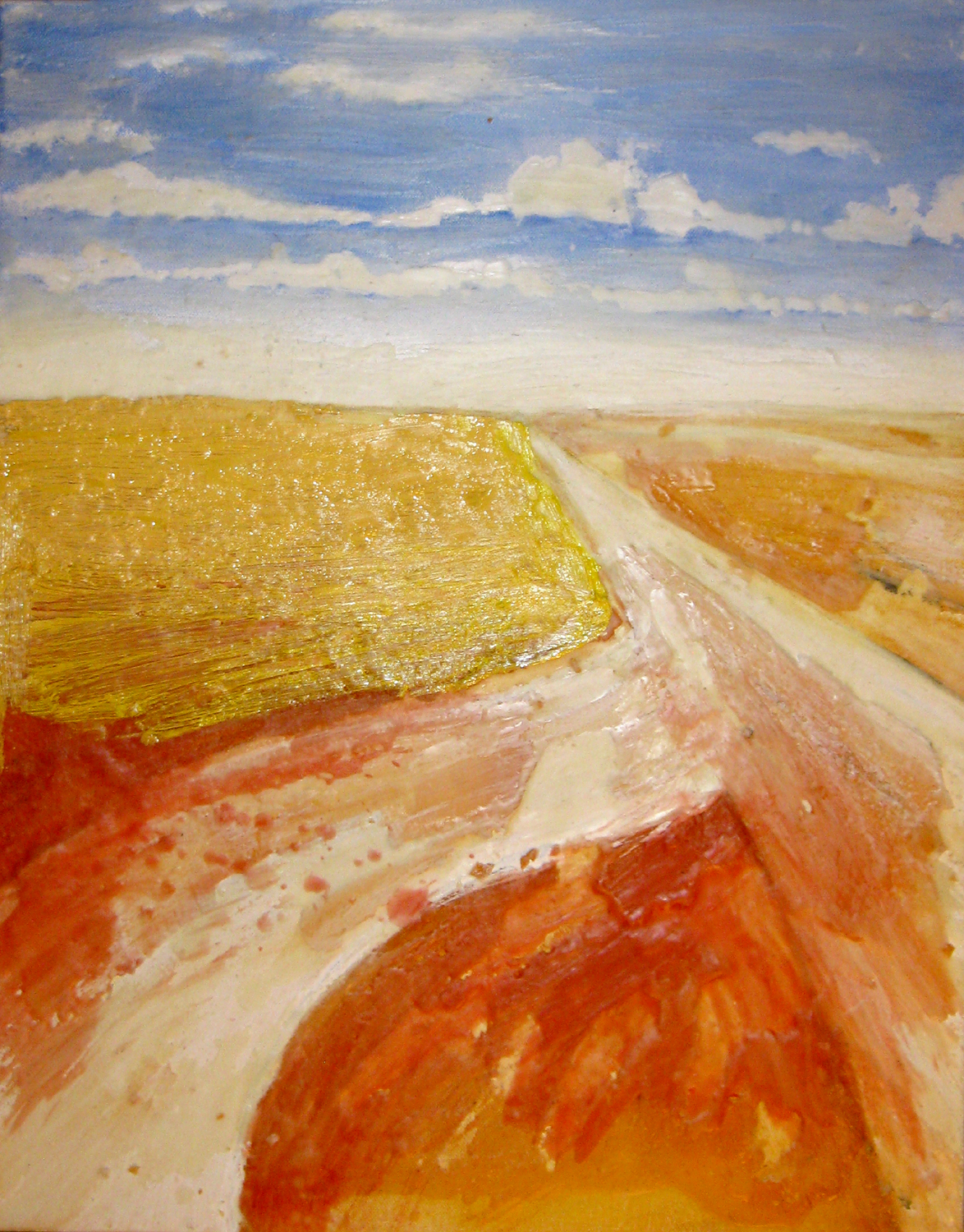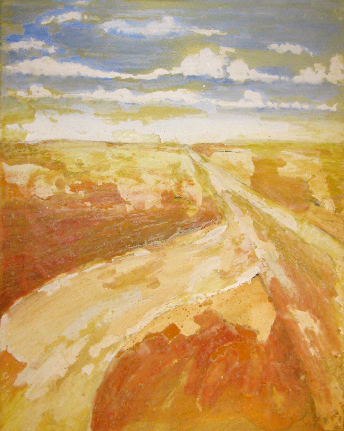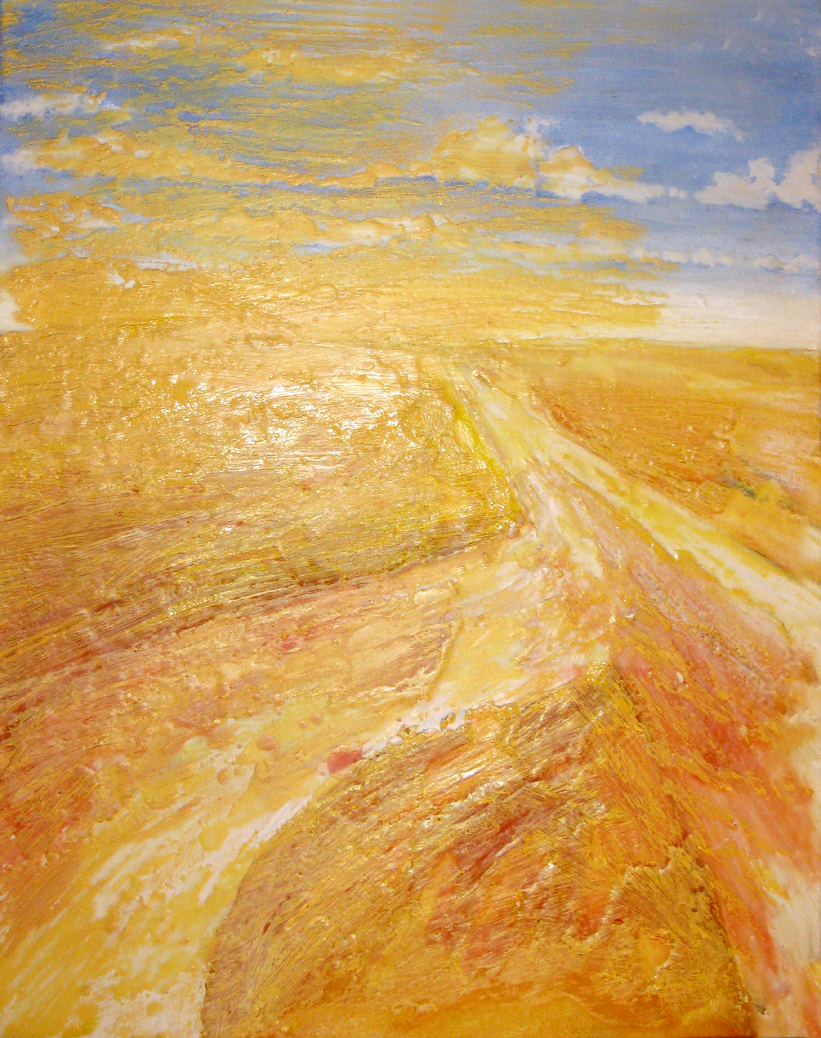 From the ink sketch, I knew that I wanted to keep this image as simple as possible. The horizon line was the most important part of the scene, it needed show how expansive this space can be. After adding more layers of wax to get that eroding feeling of things past, the picture became a heavily textural piece with the overhead viewpoint just askew. When there is plenty of texture, it seems to create a more energetic feeling with a sense of time moving along.