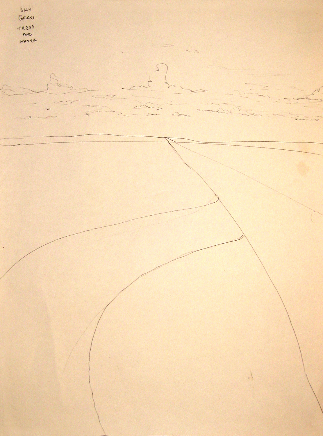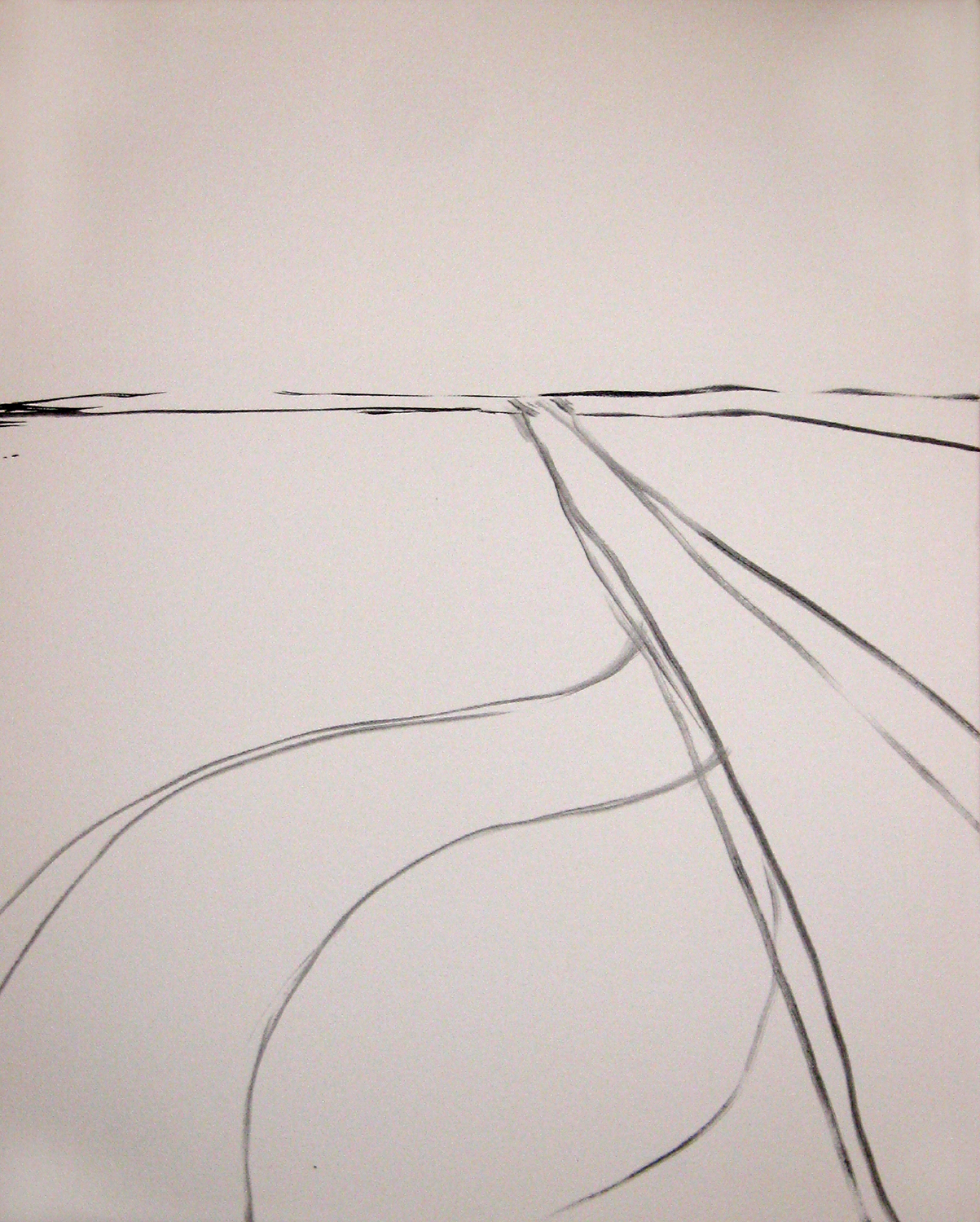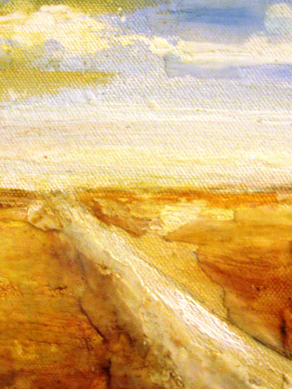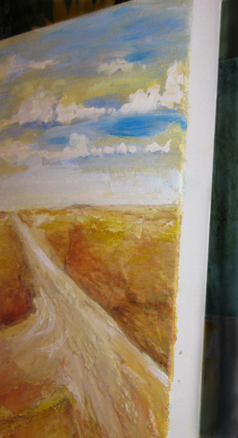 From the ink sketch, I knew that I wanted to keep this image as simple as possible. The horizon line was the most important part of the scene, it needed show how expansive this space can be. After adding more layers of wax to get that eroding feeling of things past, the picture became a heavily textural piece with the overhead viewpoint just askew. When there is plenty of texture, it seems to create a more energetic feeling with a sense of time moving along.