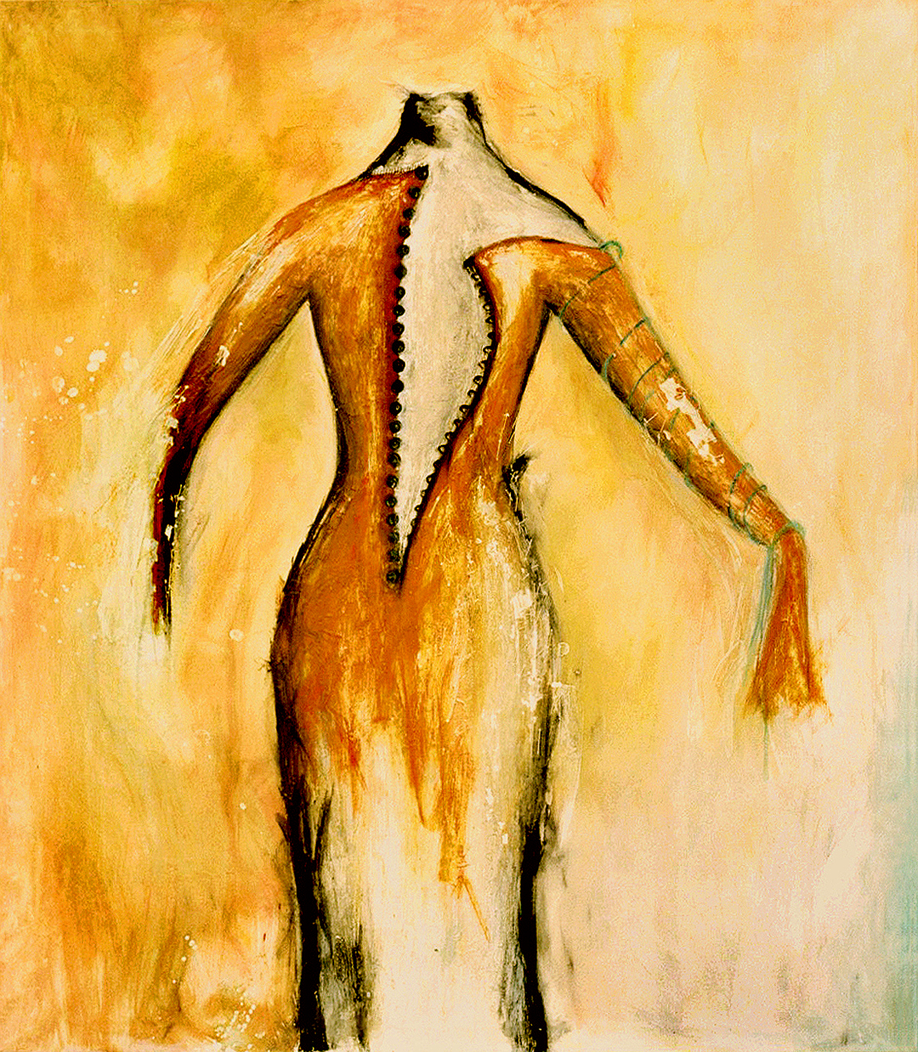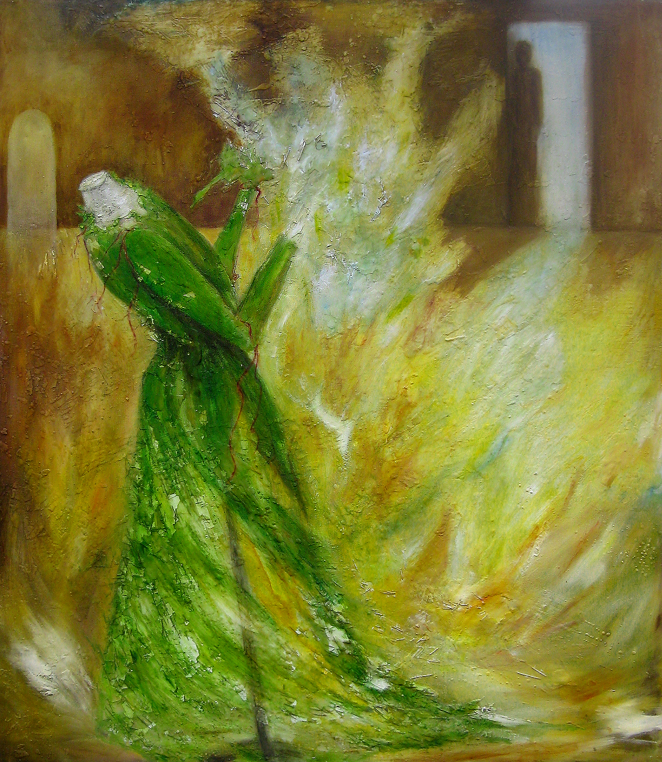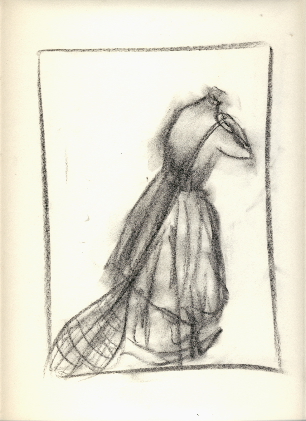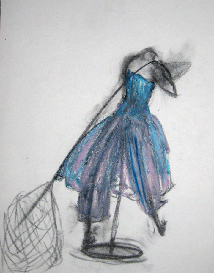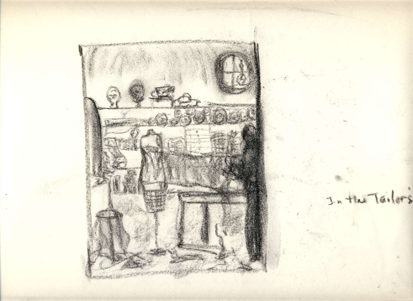 “In the Tailor Shop” is a of a story about a mannequin who gained a soul through a tailor’s imagination. The story was from an obscure French play written by Anim D’Alo, taking place in the early 1800’s. Synopsis: An orphaned little boy runs away and finds a gentle blind tailor who wants someone to help him create his masterpieces. The orphan becomes his assistant and sews the tailor’s magnificent dresses for the town to see. They set them up in the window and as the passersby look at the mannequin who graces these clothes, the mannequin gains a conscience and ends up falling in love with an eccentric man about town, Monsieur Beau. This gentleman ends up saving her in a fire, a fire she starts by accident in one of her imaginative episodes and it is this man, who finds her in the ashes and brings her to life. Unfortunately, the Blind Tailor and his assistant die in the fire. A strange story, partly because of the subject matter, but also the feeling it imparted. As the very essence of the tale came to me, I sketched out these scenes where she imagines her thoughts coming to life. They translated into “still lifes” that were haunting and vague, yet intriguing pieces.
