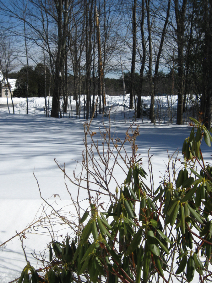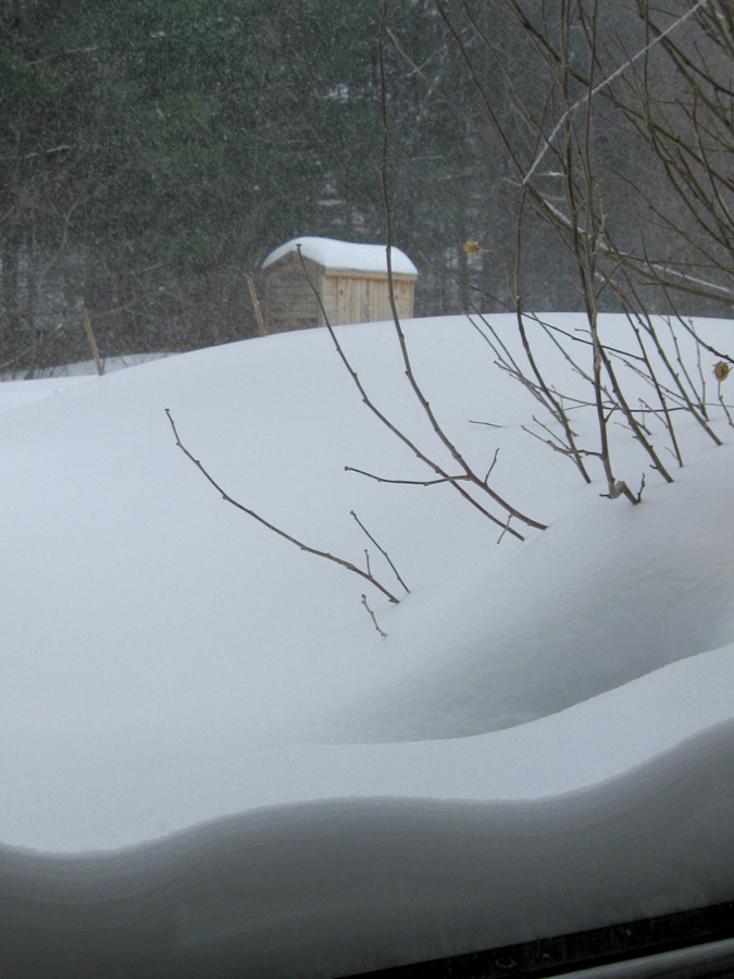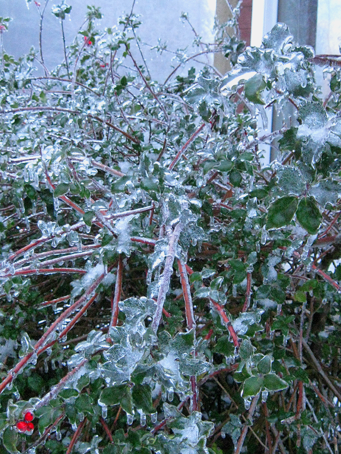 blizzard, evening snow, frozen bushes, frozen leaves, garden in winter, high snow level, ice, ice on branches, in a small corner of the world there is a garden 2015 winter, New England snow, view snow through windows, winter
