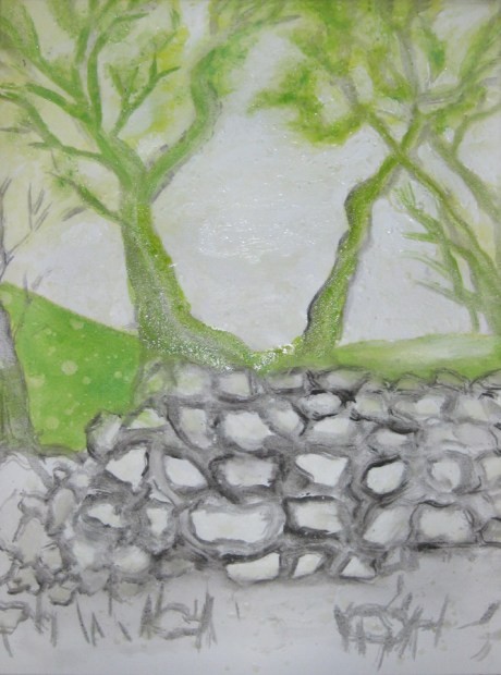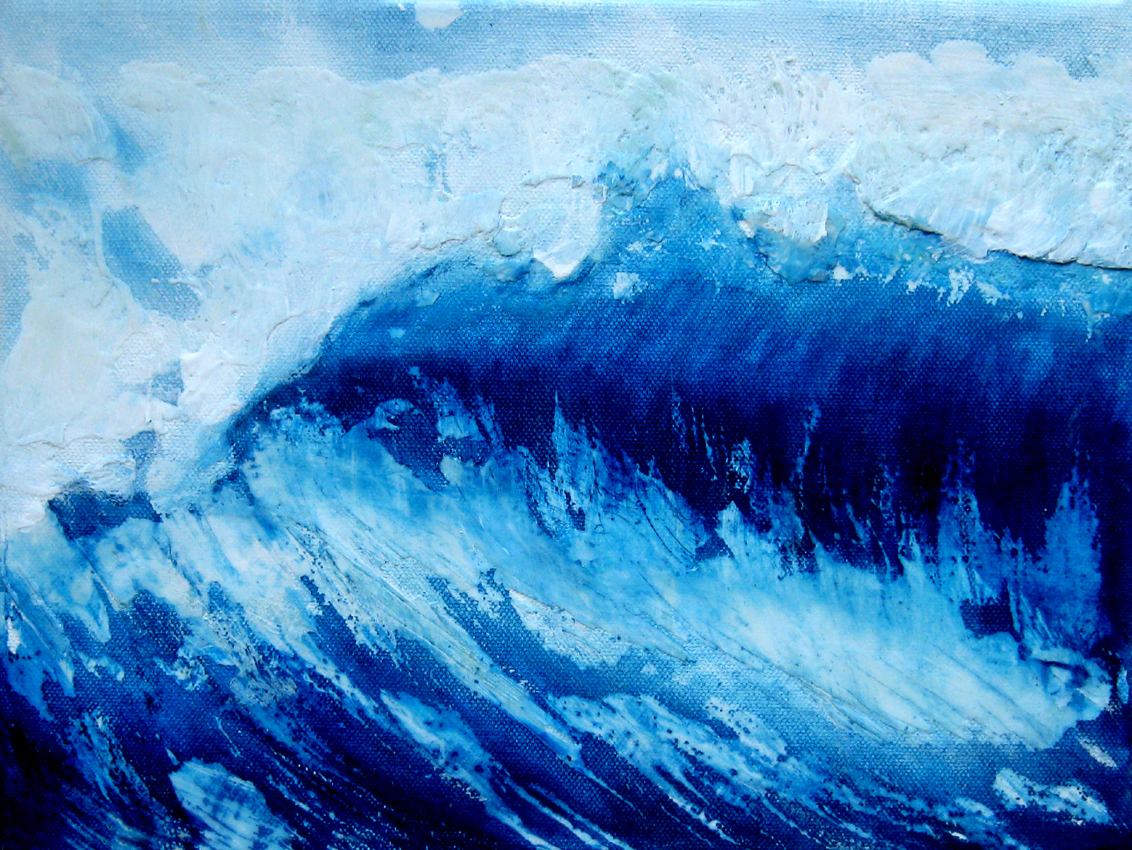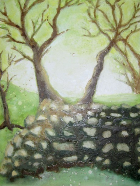 I drew out the design in pencil on a piece of linen and painted red and yellow fish with Jacquard’s painting dye. Let it dry to set. Then, melted wax to 350 degrees and brushed it over the fish so they would not be dyed in the subsequent dye bath, or, wherever I wanted to keep the image white. The wax acts as a resist to the dye.