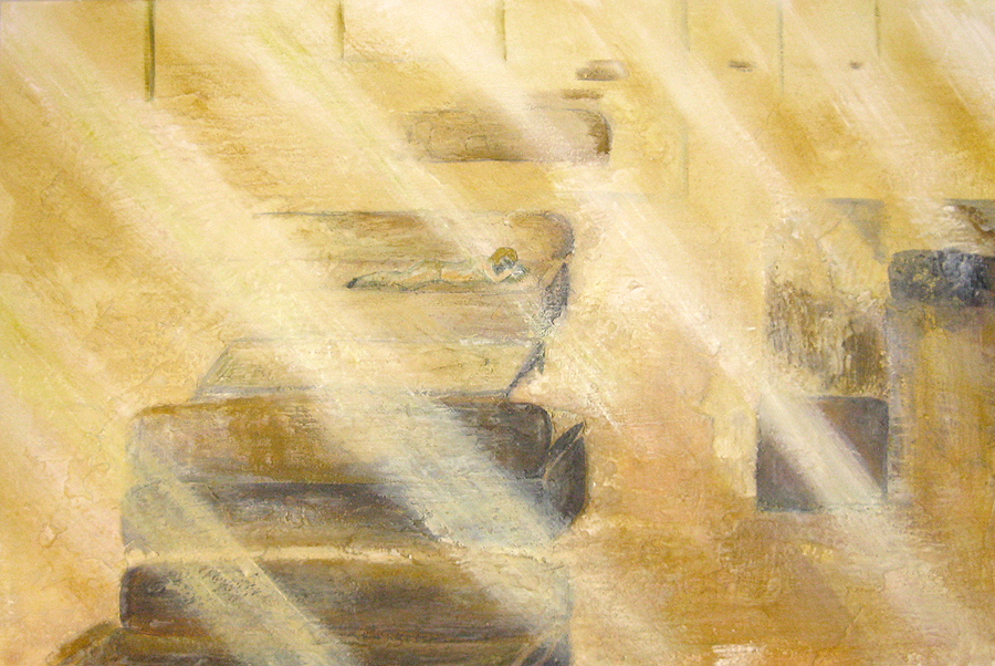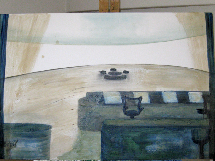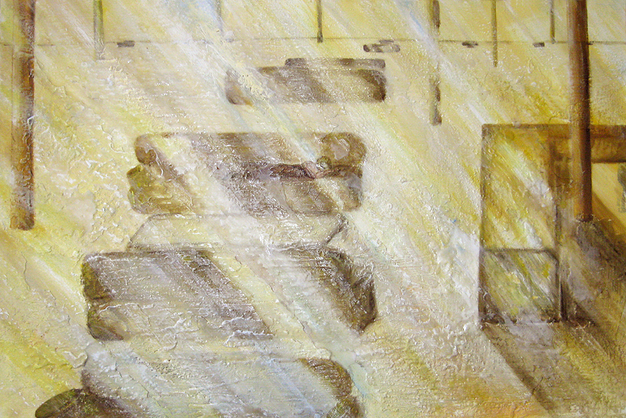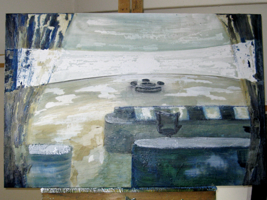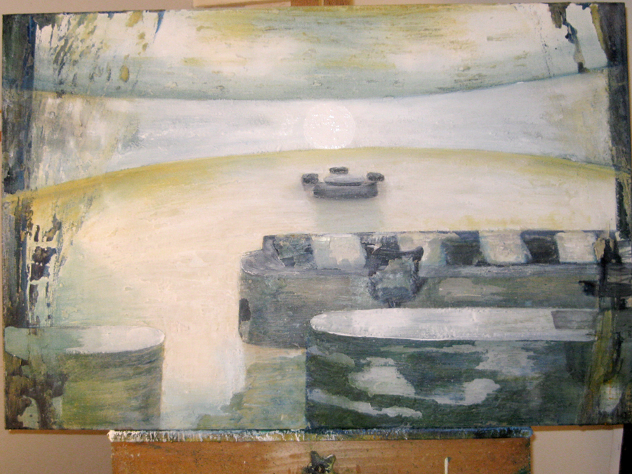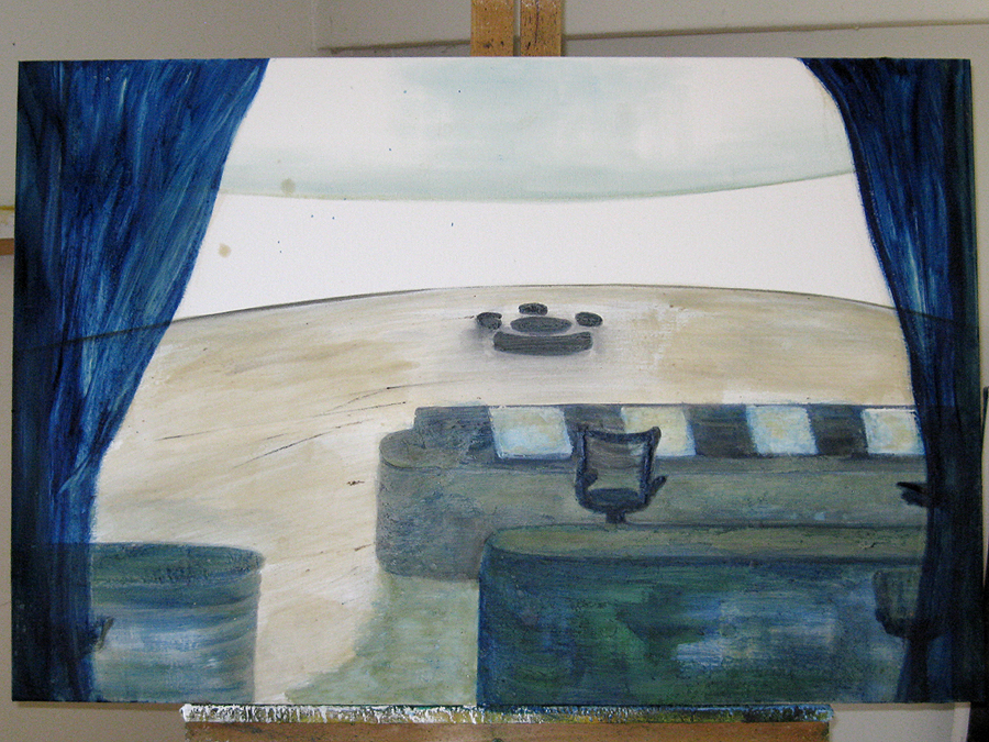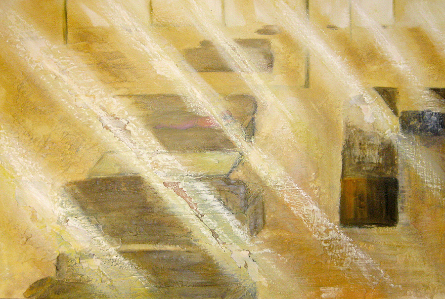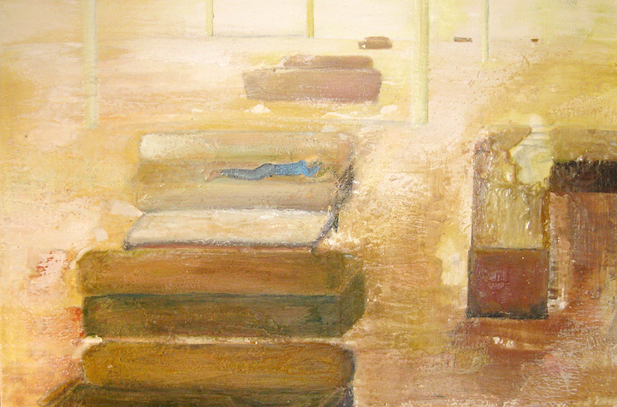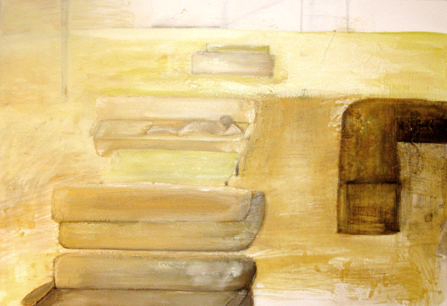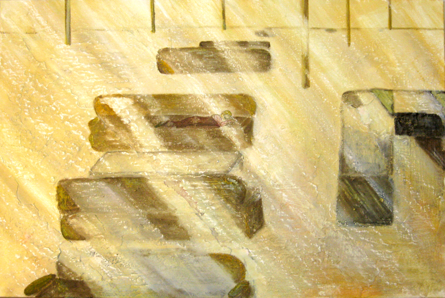 Finding adequate light for this piece proved to be more difficult than expected. The sun wanted to be very white, as well as the floor and the ceiling. I kept adding more and more gesso to get the intensity of light. I also wanted to get a more static feel to the piece by applying small particles of wax, but each time, I scraped off more and more of the ‘atmosphere’ to create a smoother appearance. This painting wanted the cool, uncomplicated feeling I started with in the early sketches. I couldn’t veer off from that path as much as I tried. The image remains very simple. ‘Sunrise’ is apart of the bleedthrough (past) series; a series of rooms that have a long perspective with light or darkness at their farthest point. They are abandoned rooms of another time, crumbling away, but at the same time, being filled with a light that remembers. What might appear as an office area, is now empty and the only life is the sun.