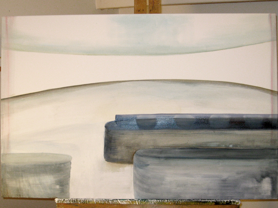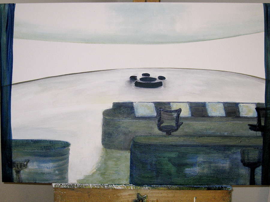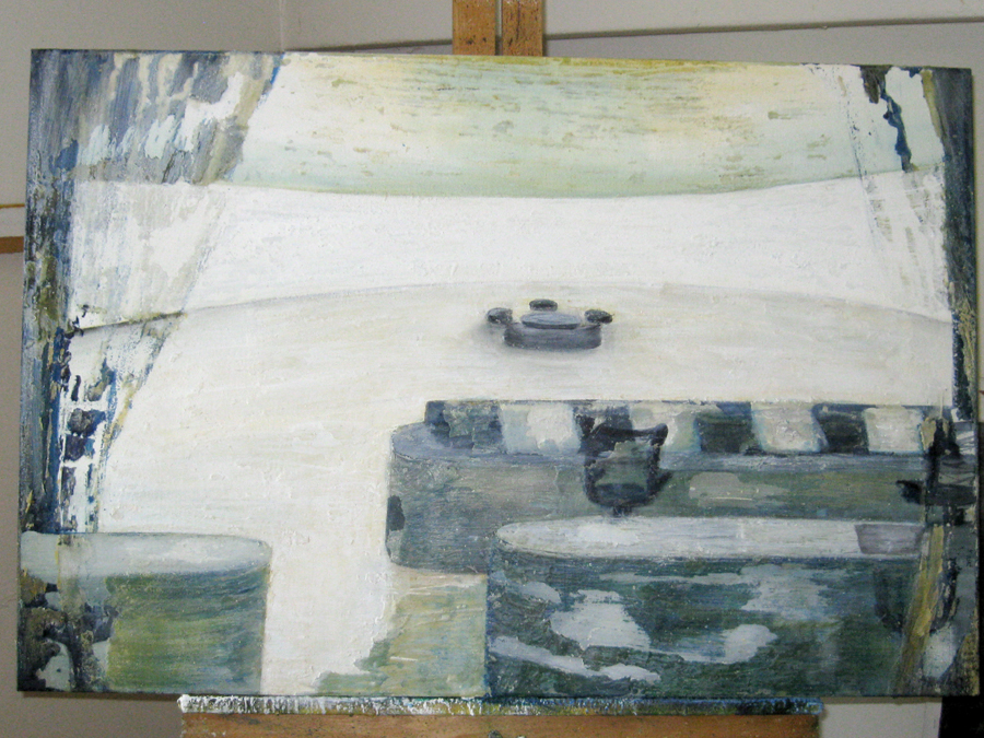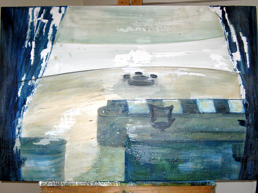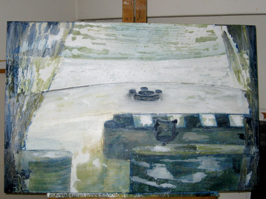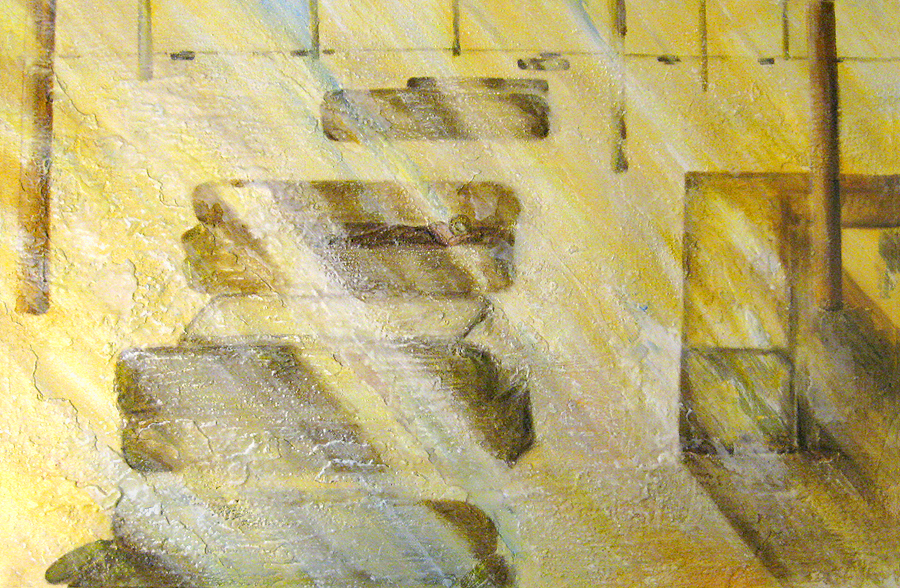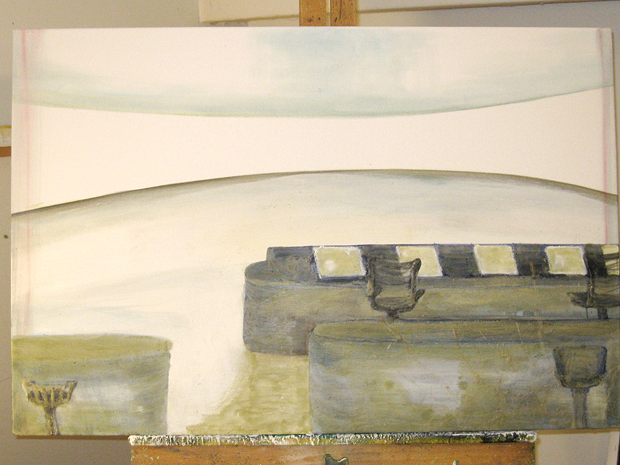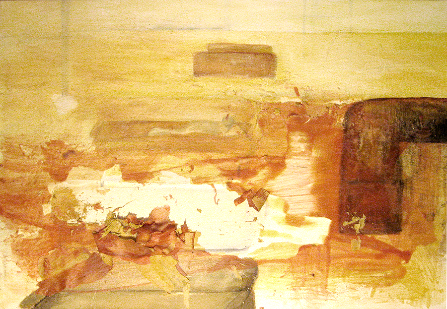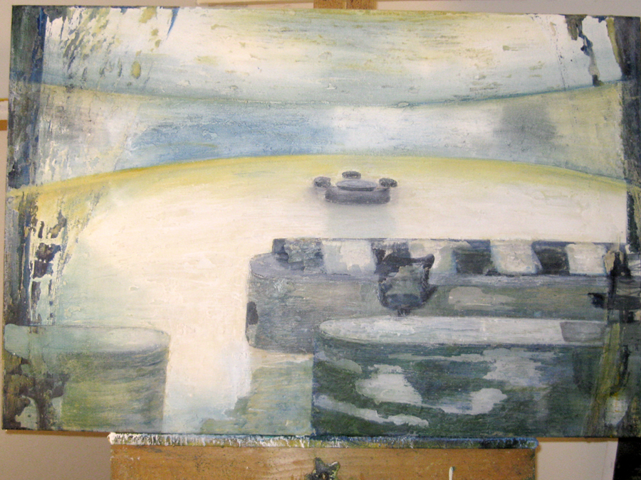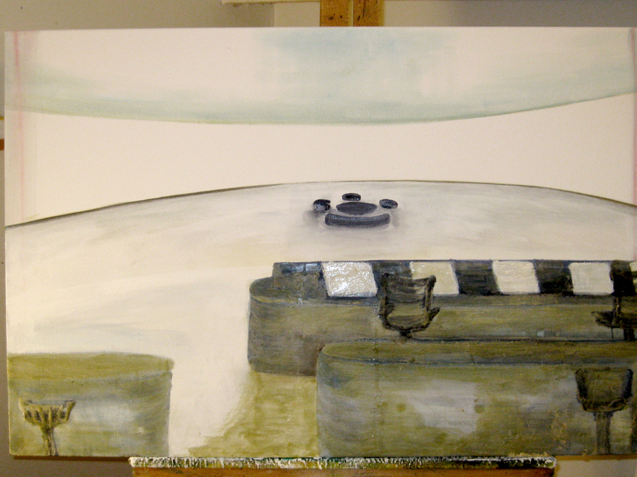 Finding adequate light for this piece proved to be more difficult than expected. The sun wanted to be very white, as well as the floor and the ceiling. I kept adding more and more gesso to get the intensity of light. I also wanted to get a more static feel to the piece by applying small particles of wax, but each time, I scraped off more and more of the ‘atmosphere’ to create a smoother appearance. This painting wanted the cool, uncomplicated feeling I started with in the early sketches. I couldn’t veer off from that path as much as I tried. The image remains very simple. ‘Sunrise’ is apart of the bleedthrough (past) series; a series of rooms that have a long perspective with light or darkness at their farthest point. They are abandoned rooms of another time, crumbling away, but at the same time, being filled with a light that remembers. What might appear as an office area, is now empty and the only life is the sun.