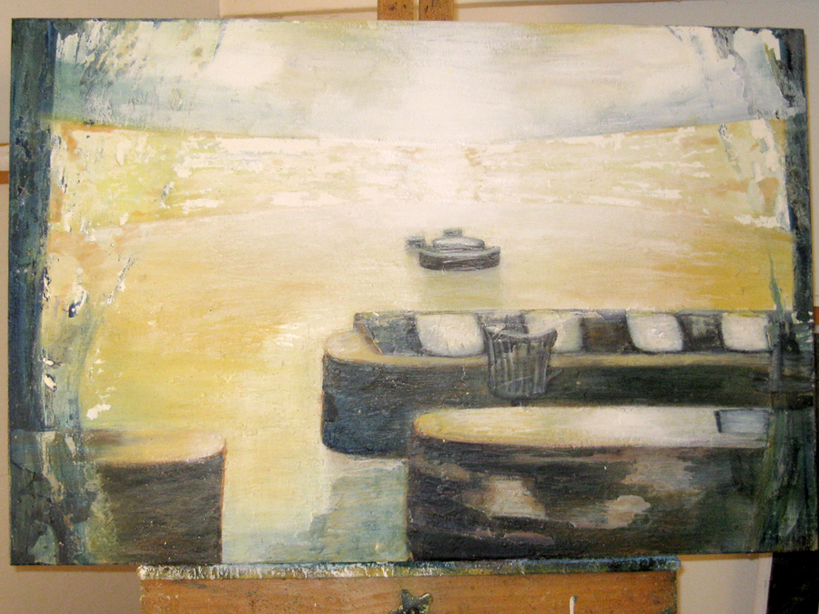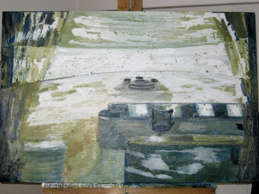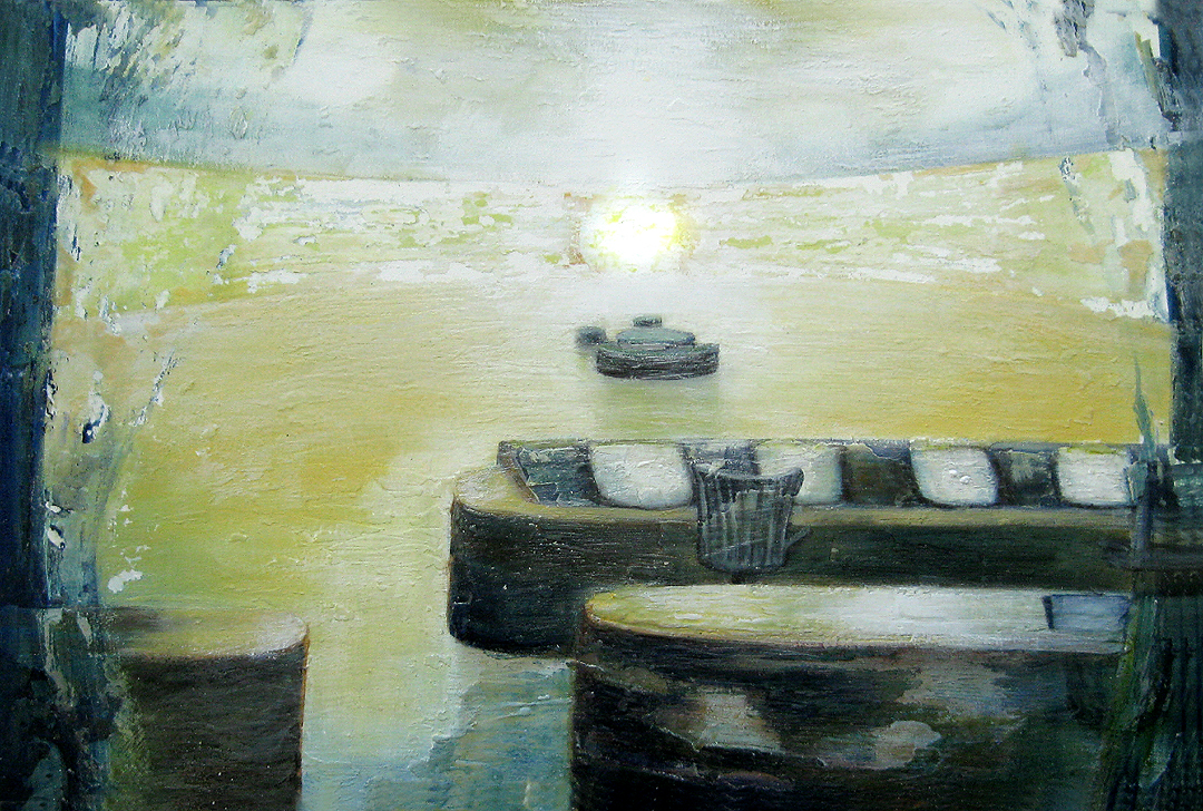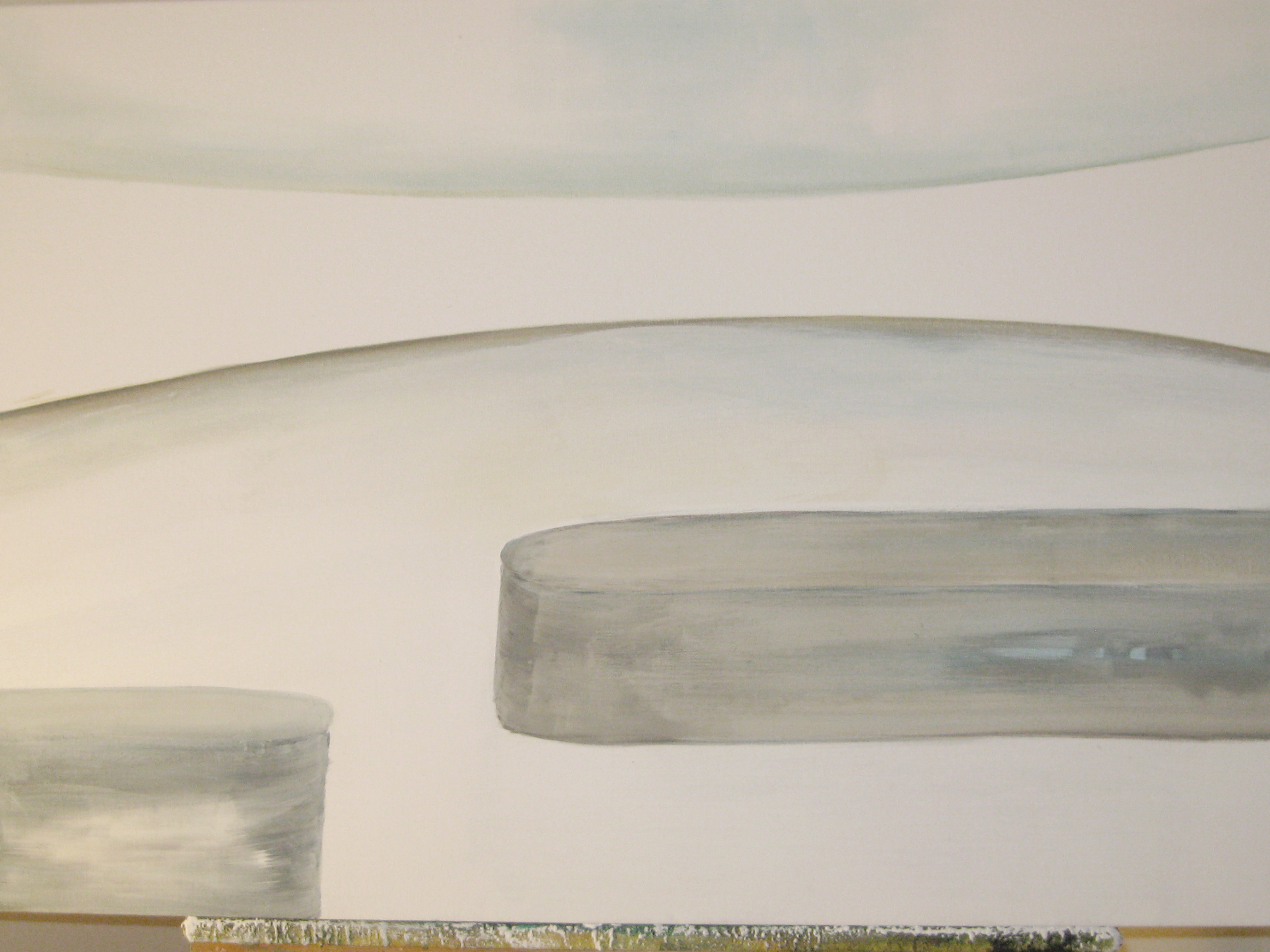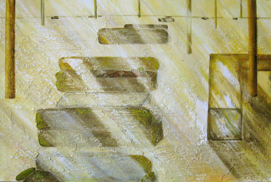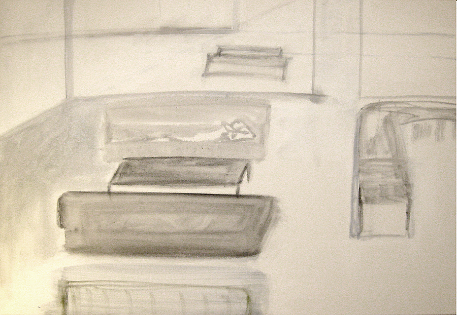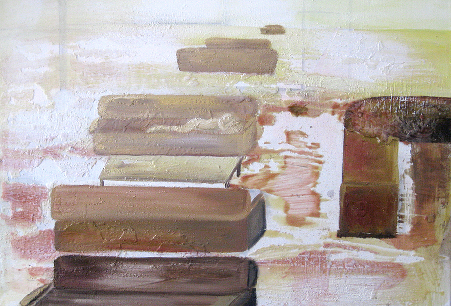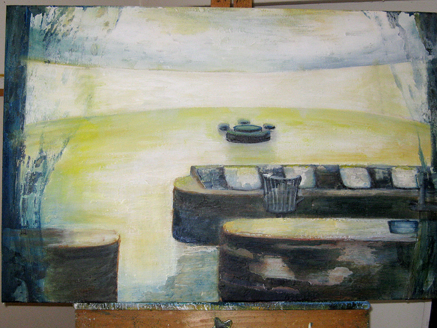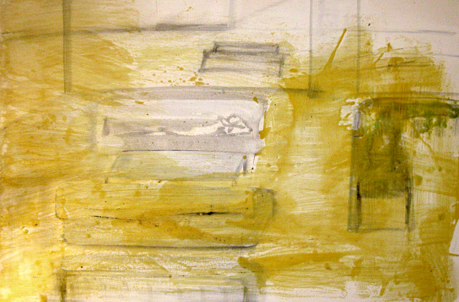 Finding adequate light for this piece proved to be more difficult than expected. The sun wanted to be very white, as well as the floor and the ceiling. I kept adding more and more gesso to get the intensity of light. I also wanted to get a more static feel to the piece by applying small particles of wax, but each time, I scraped off more and more of the ‘atmosphere’ to create a smoother appearance. This painting wanted the cool, uncomplicated feeling I started with in the early sketches. I couldn’t veer off from that path as much as I tried. The image remains very simple. ‘Sunrise’ is apart of the bleedthrough (past) series; a series of rooms that have a long perspective with light or darkness at their farthest point. They are abandoned rooms of another time, crumbling away, but at the same time, being filled with a light that remembers. What might appear as an office area, is now empty and the only life is the sun.