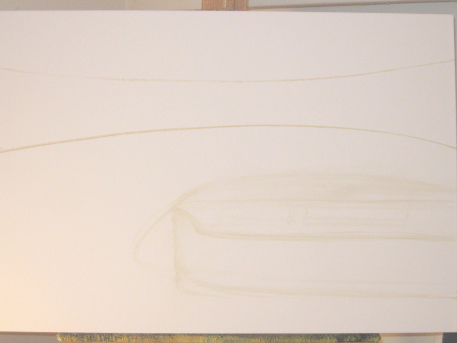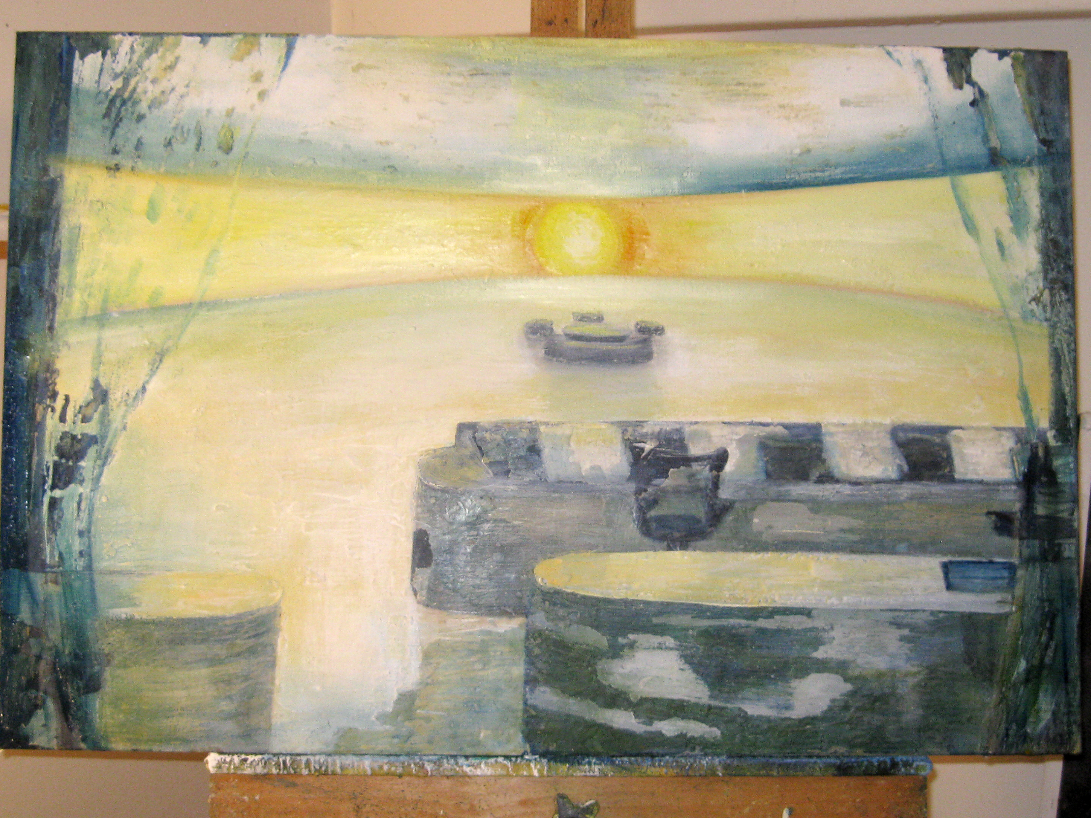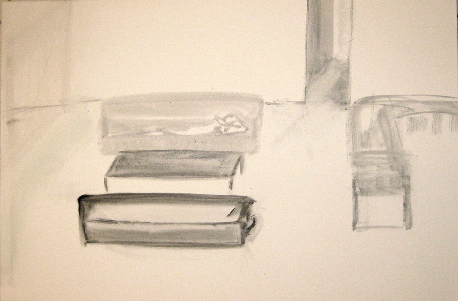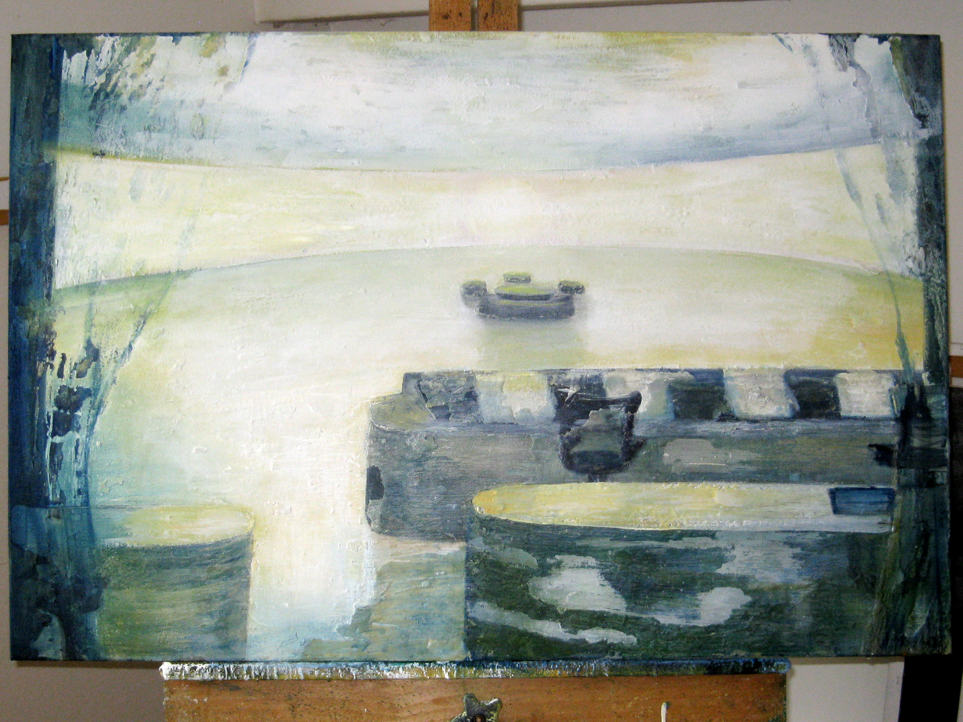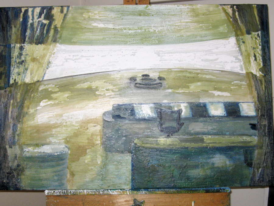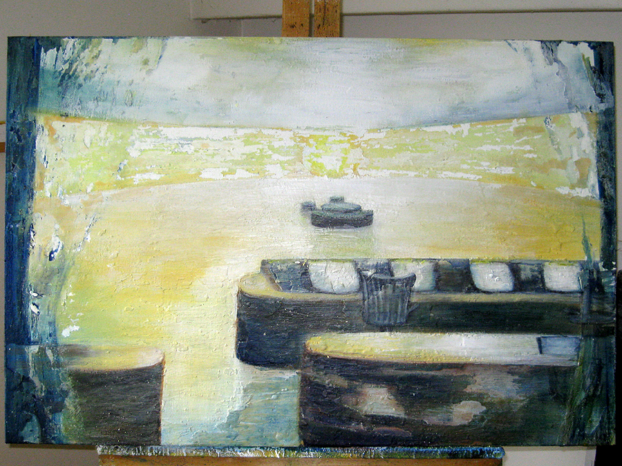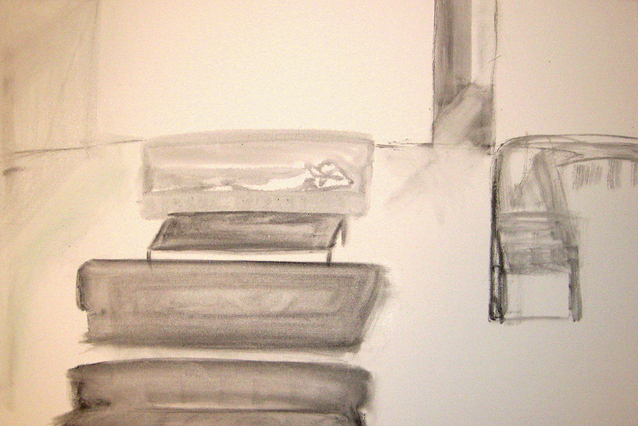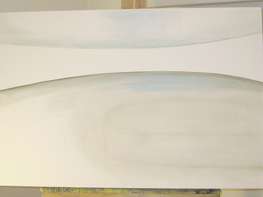 Finding adequate light for this piece proved to be more difficult than expected. The sun wanted to be very white, as well as the floor and the ceiling. I kept adding more and more gesso to get the intensity of light. I also wanted to get a more static feel to the piece by applying small particles of wax, but each time, I scraped off more and more of the ‘atmosphere’ to create a smoother appearance. This painting wanted the cool, uncomplicated feeling I started with in the early sketches. I couldn’t veer off from that path as much as I tried. The image remains very simple. ‘Sunrise’ is apart of the bleedthrough (past) series; a series of rooms that have a long perspective with light or darkness at their farthest point. They are abandoned rooms of another time, crumbling away, but at the same time, being filled with a light that remembers. What might appear as an office area, is now empty and the only life is the sun.